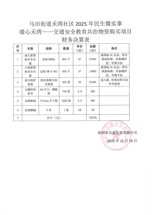 项目公示|光明区马田街道禾湾社区2025年民生微实事暖心禾湾——交通安全教育共治物资购买项目财务决算表