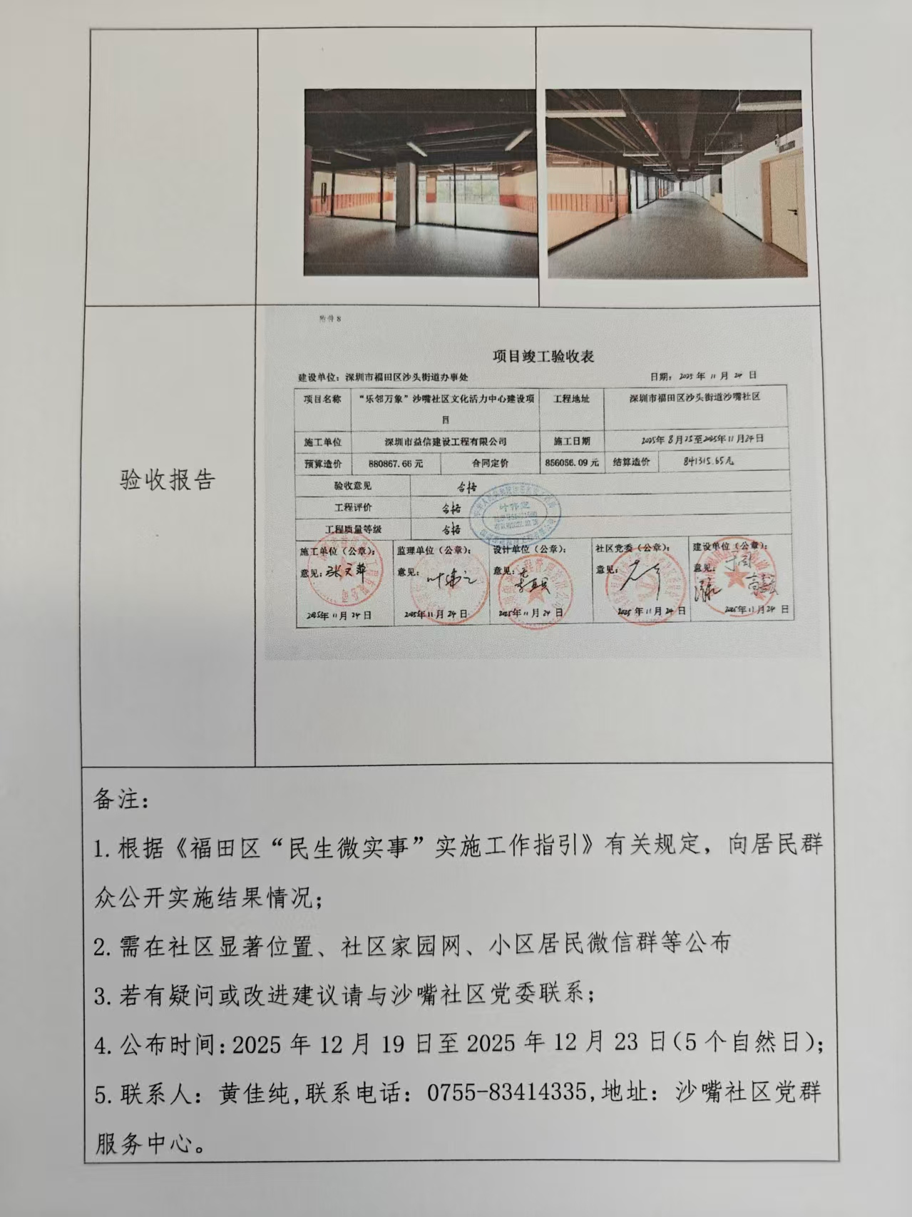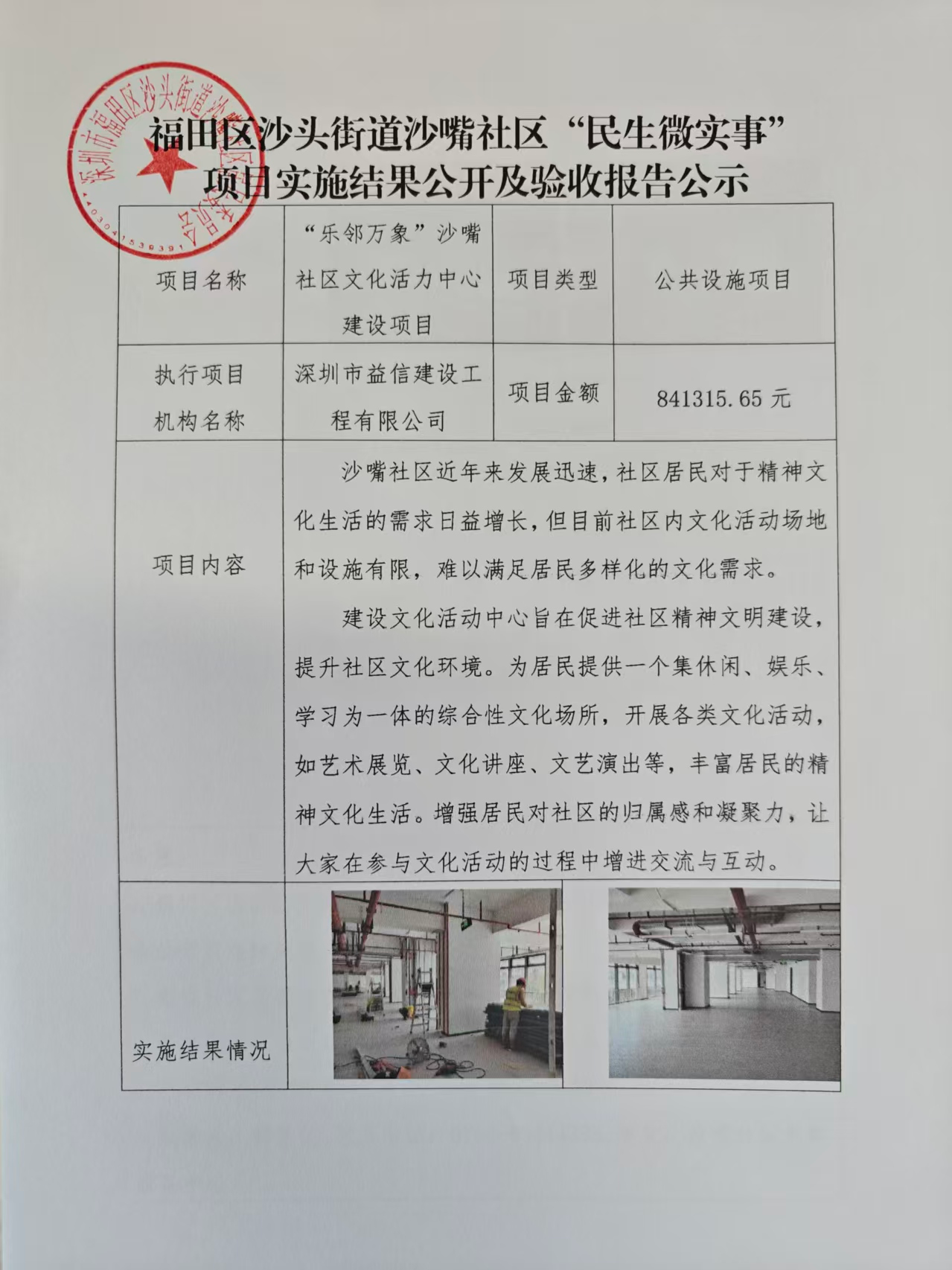 项目公示|福田区沙头街道沙嘴社区“乐邻万象”沙嘴社区文化活力中心建设项目“民生微实事”项目实施结果公开及验收报告公示