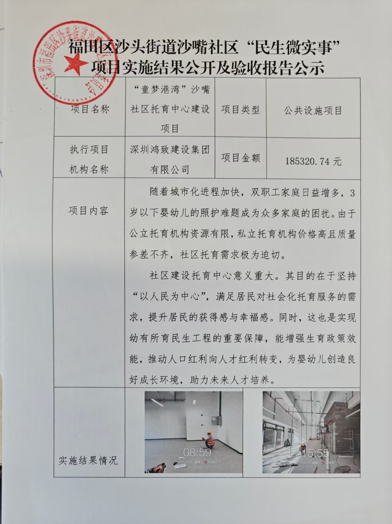 项目公示|福田区沙头街道沙嘴社区“童梦港湾”沙嘴社区托育中心建设项目“民生微实事”项目实施结果公开及验收报告公示