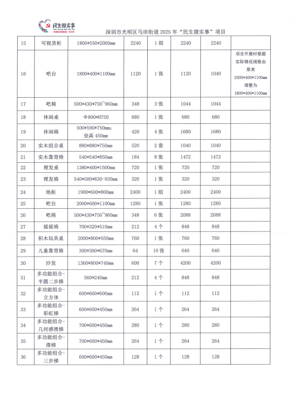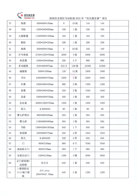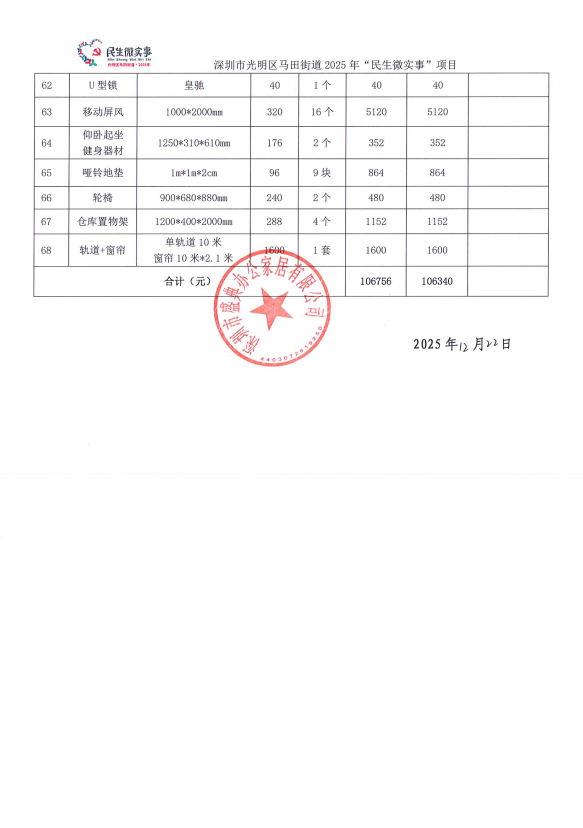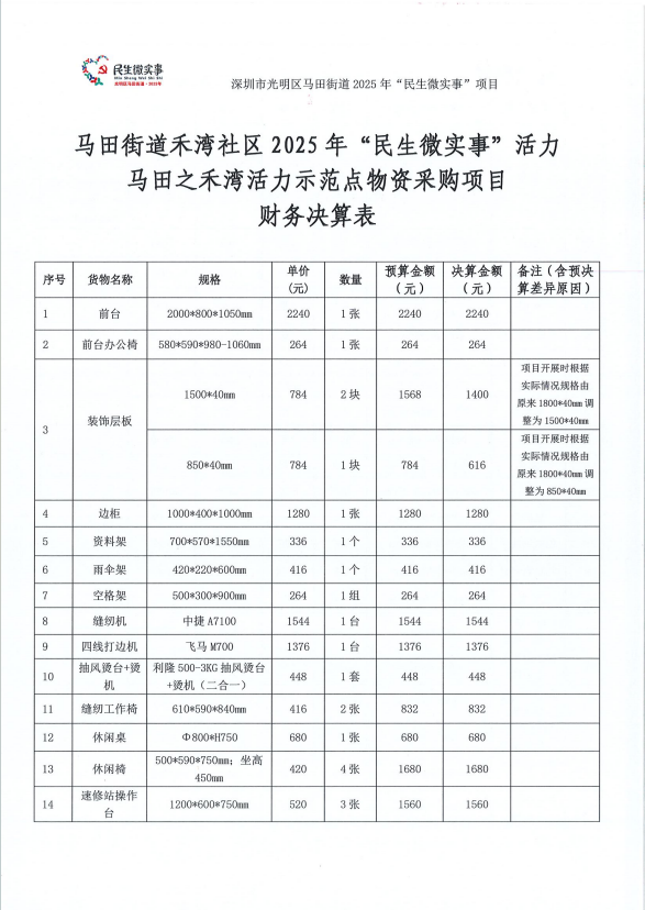 项目公示|光明区马田街道禾湾社区2025年“民生微实事”活力马田之禾湾活力示范点物资采购项目财务决算表
