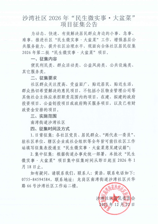 项目公示|龙岗区南湾街道沙湾社区2026年第二批“民生微实事·大盆菜”项目征集公告