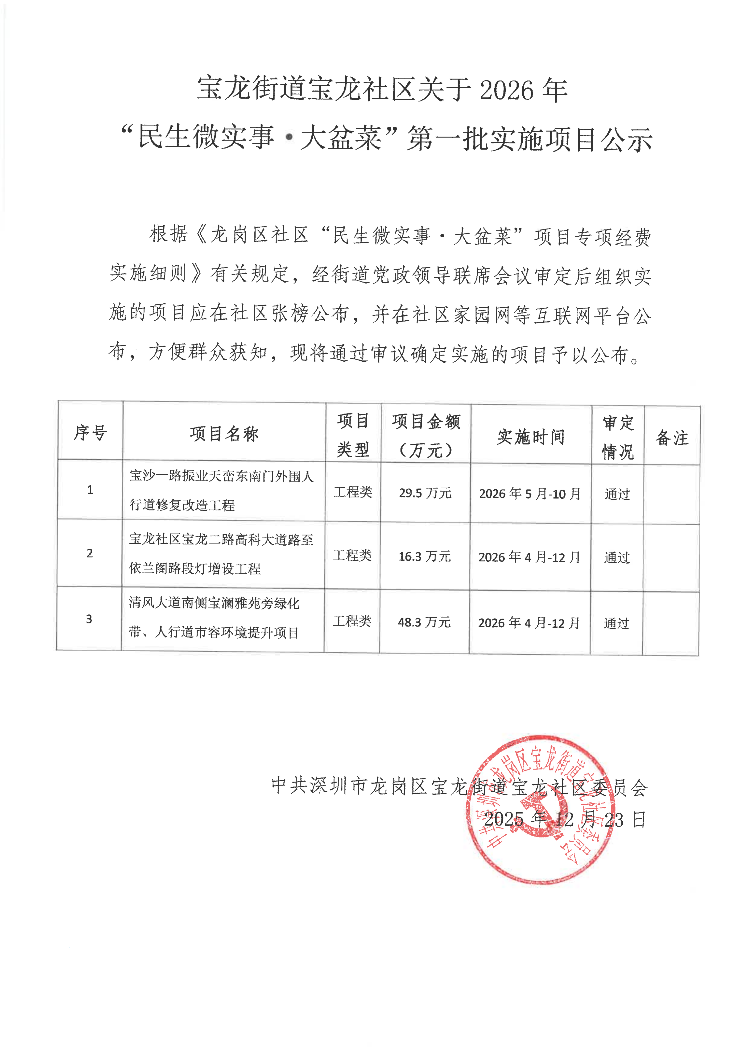 项目公示|龙岗区宝龙街道宝龙社区2026年“民生微实事·大盆菜”第一批实施项目公示
