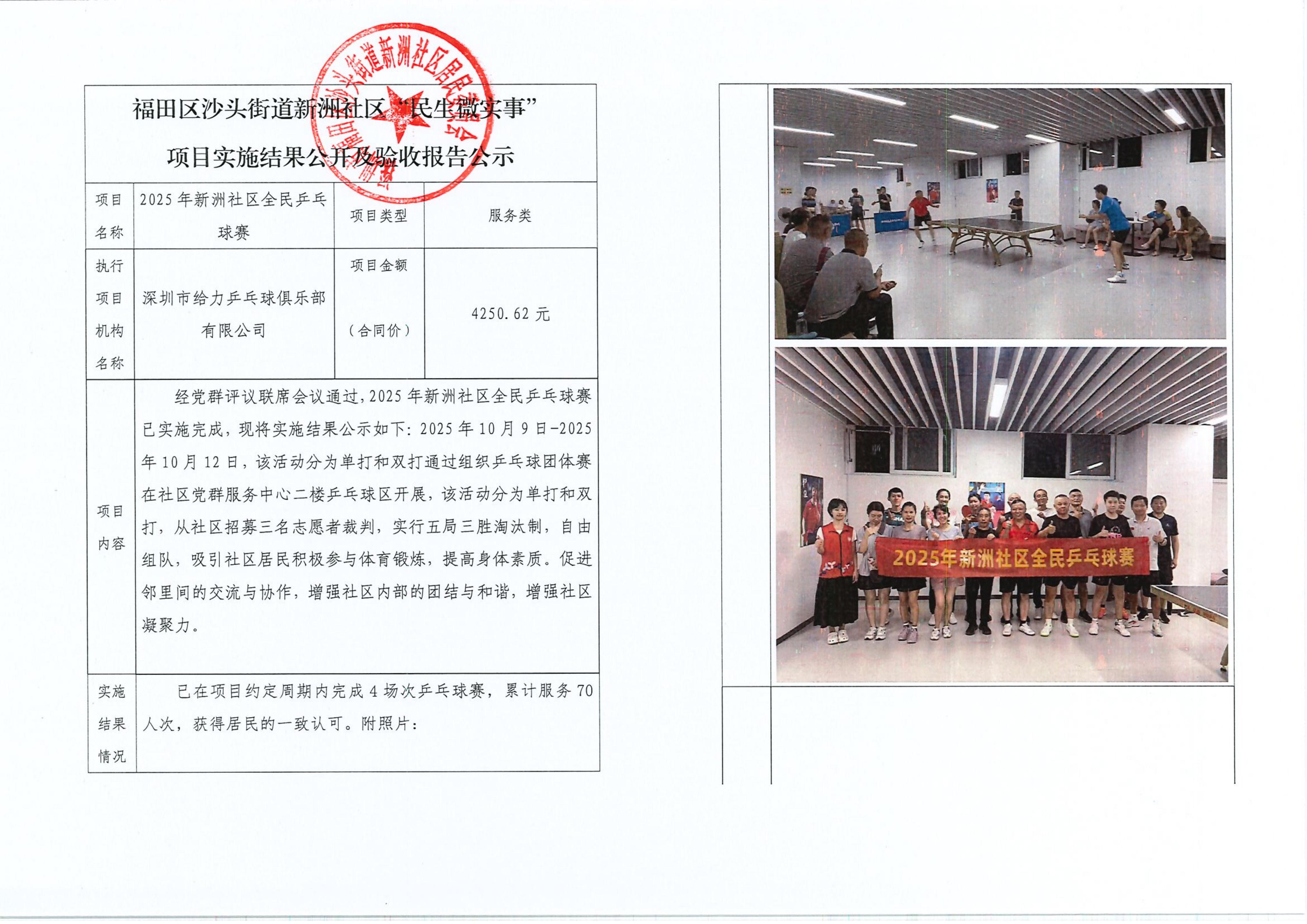 项目公示|福田区沙头街道新洲社区2025年新洲社区全民乒乓球赛“民生微实事”项目实施结果公开及验收报告公示