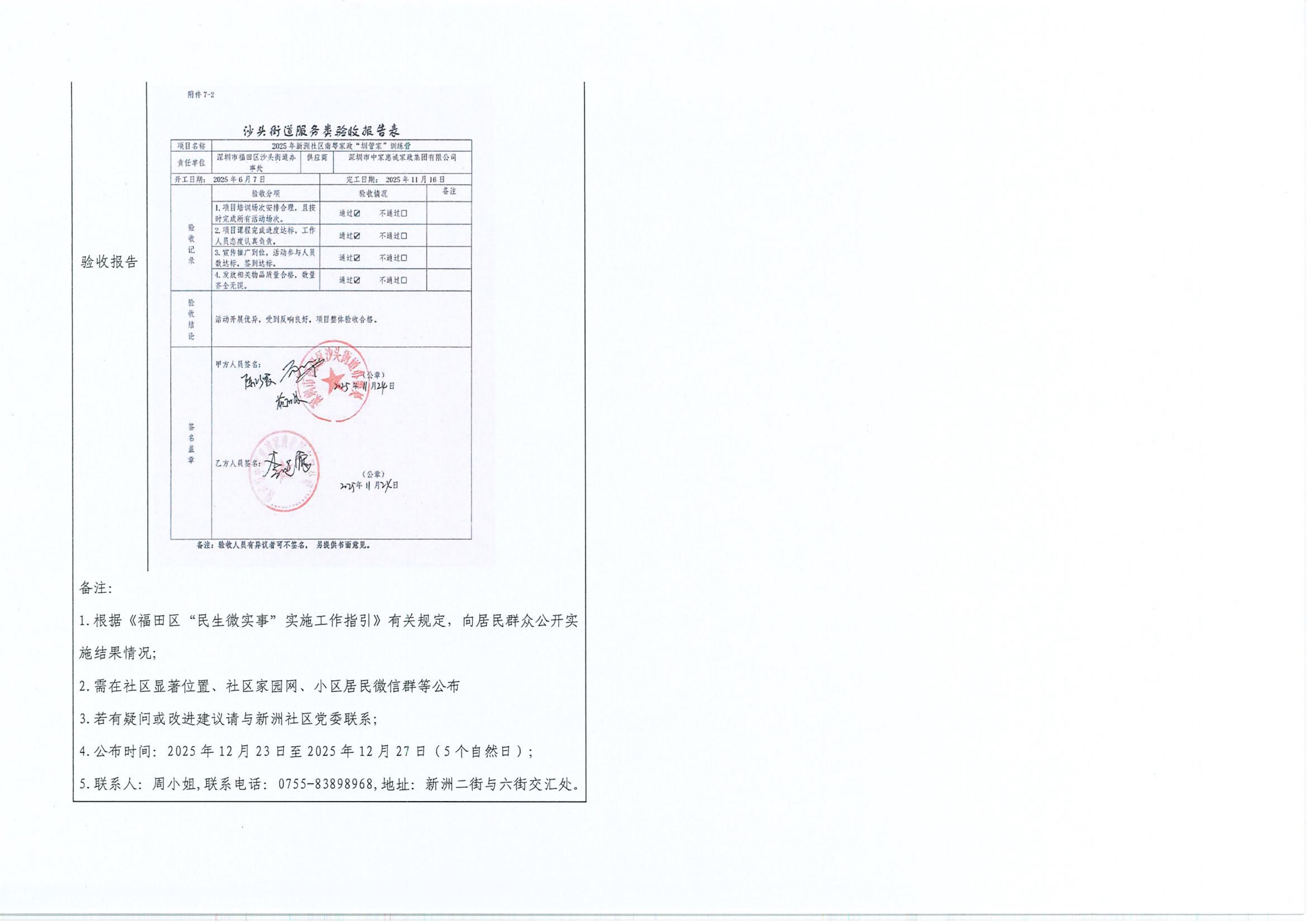 项目公示|福田区沙头街道新洲社区2025年新洲社区南粤家政“圳管家”训练营项目“民生微实事”项目实施结果公开及验收报告公示