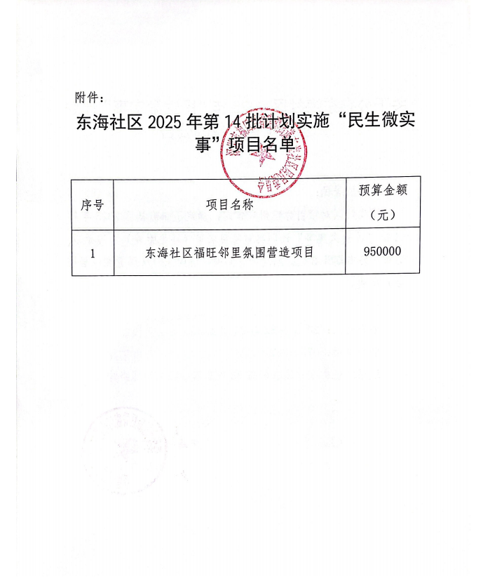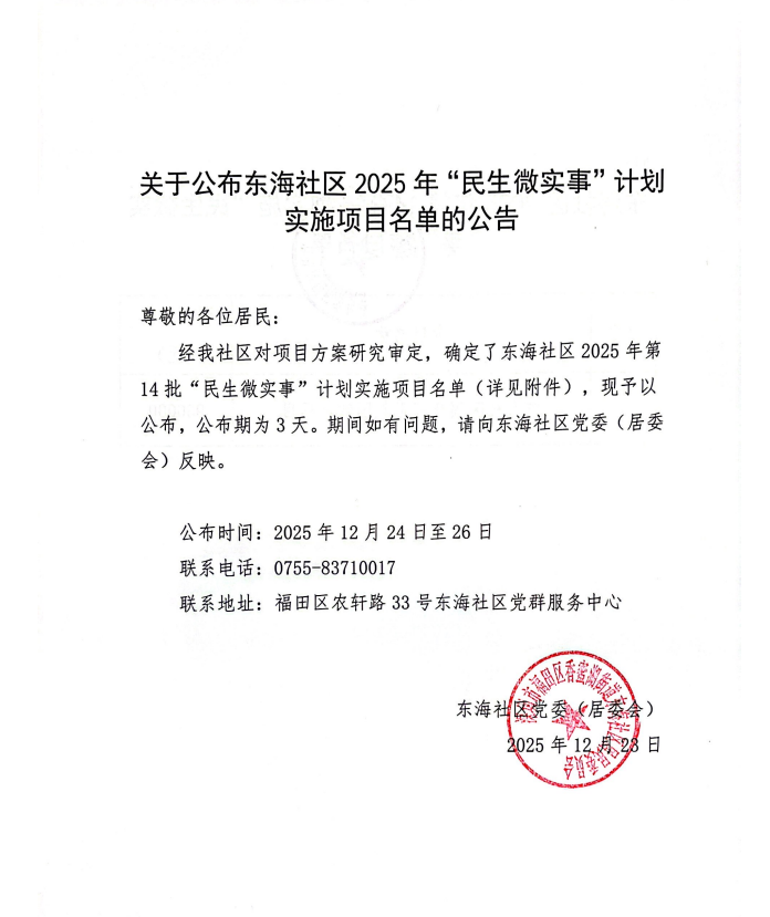 项目公示|福田区香蜜湖街道东海社区2025年第十四批“民生微实事”计划实施项目名单的公告