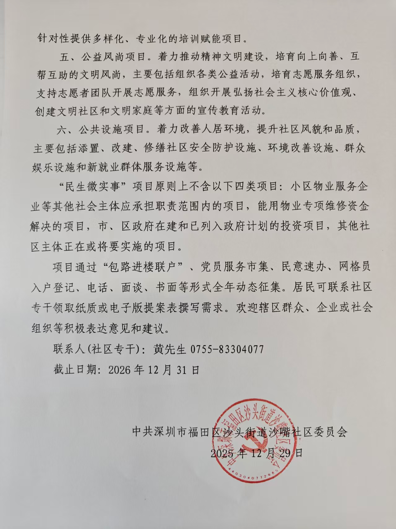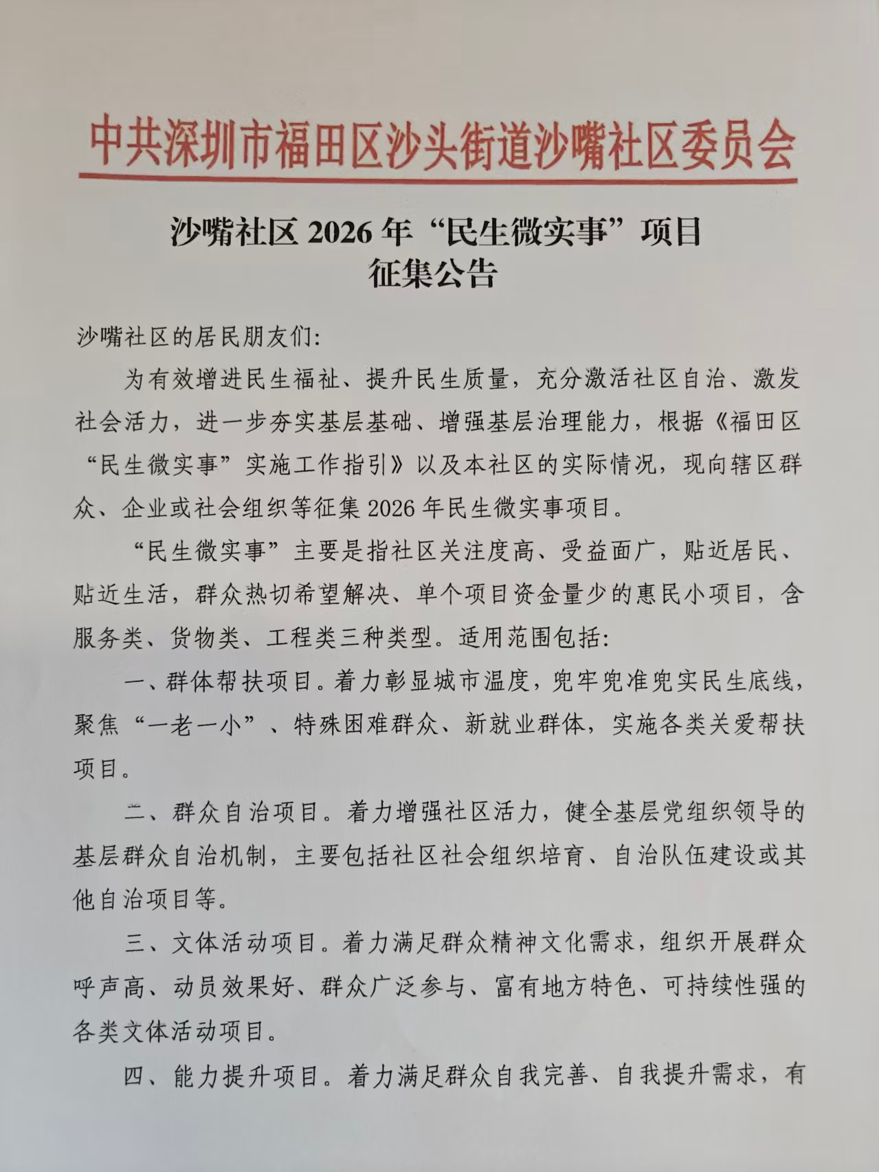 项目公示|福田区沙头街道沙嘴社区2026年“民生微实事”项目征集公告