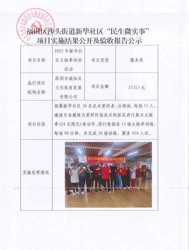 项目公示|福田区沙头街道新华社区2025年新华社区太极拳培训活动“民生微实事”项目实施结果公开及验收报告公示
