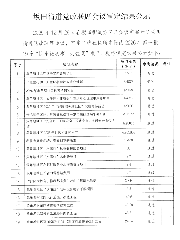 项目公示|龙岗区坂田街道象角塘社区2026年第一批“民生微实事·大盆菜”项目街道党政联席会议审定结果公示