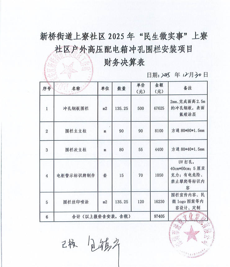 项目公示|宝安区新桥街道上寮社区2025年上寮社区户外高压配电箱冲孔围栏安装项目“民生微实事”项目财务决算表公示