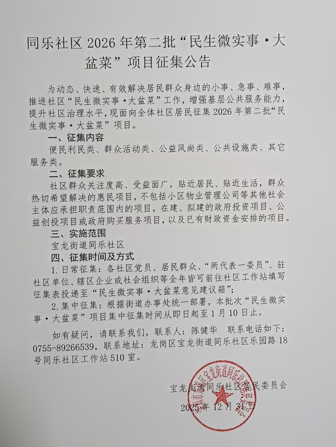 项目公示|龙岗区宝龙街道同乐社区2026年第二批“民生微实事·大盆菜”项目征集公告