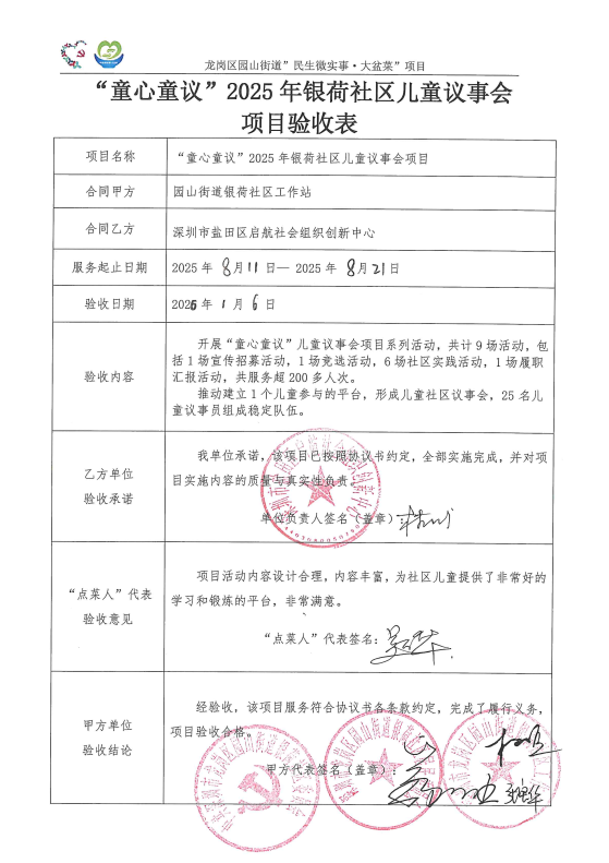 项目公示|龙岗区园山街道银荷社区2025年“童心童议”银荷社区儿童议事会“民生微实事”项目验收公示