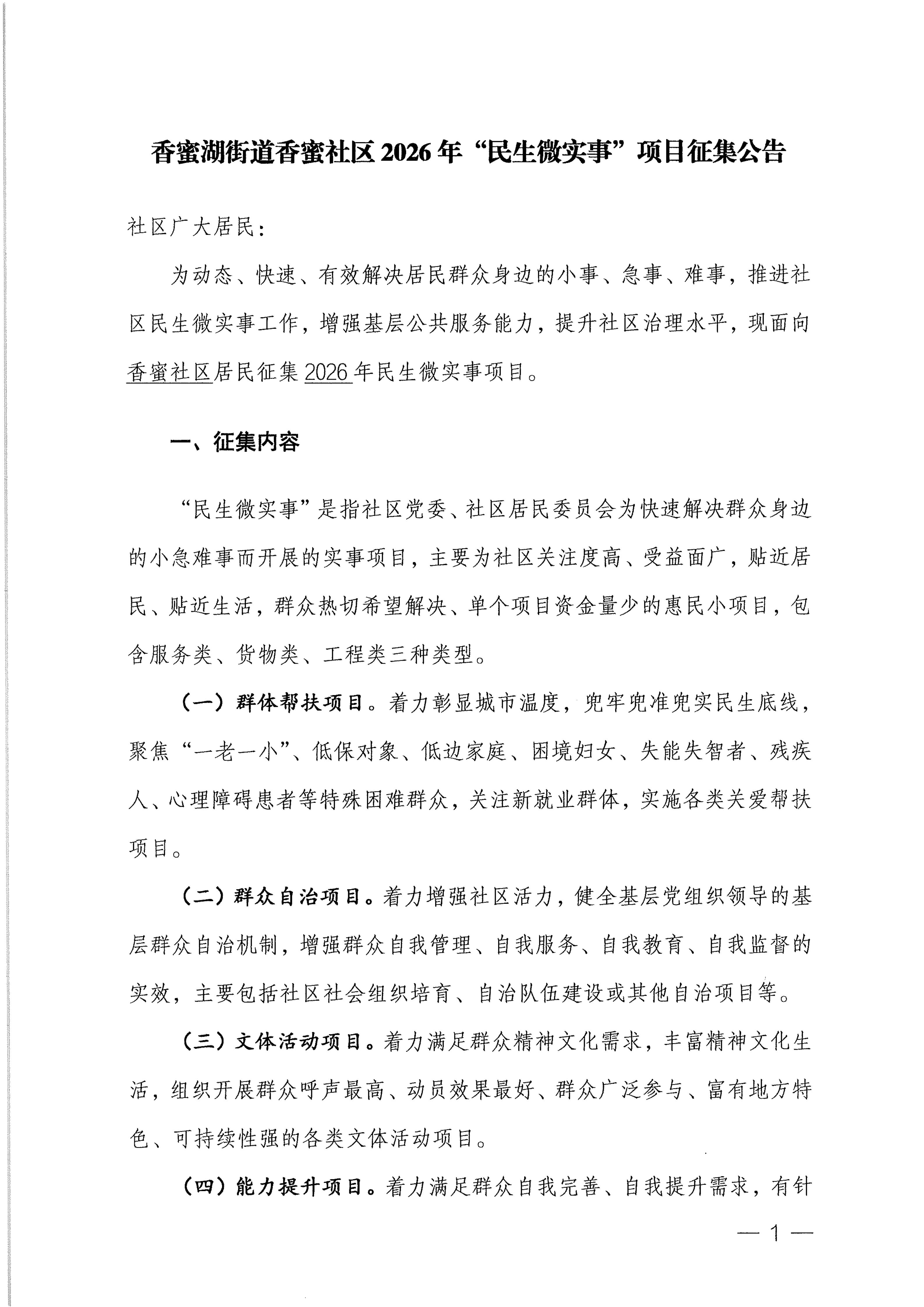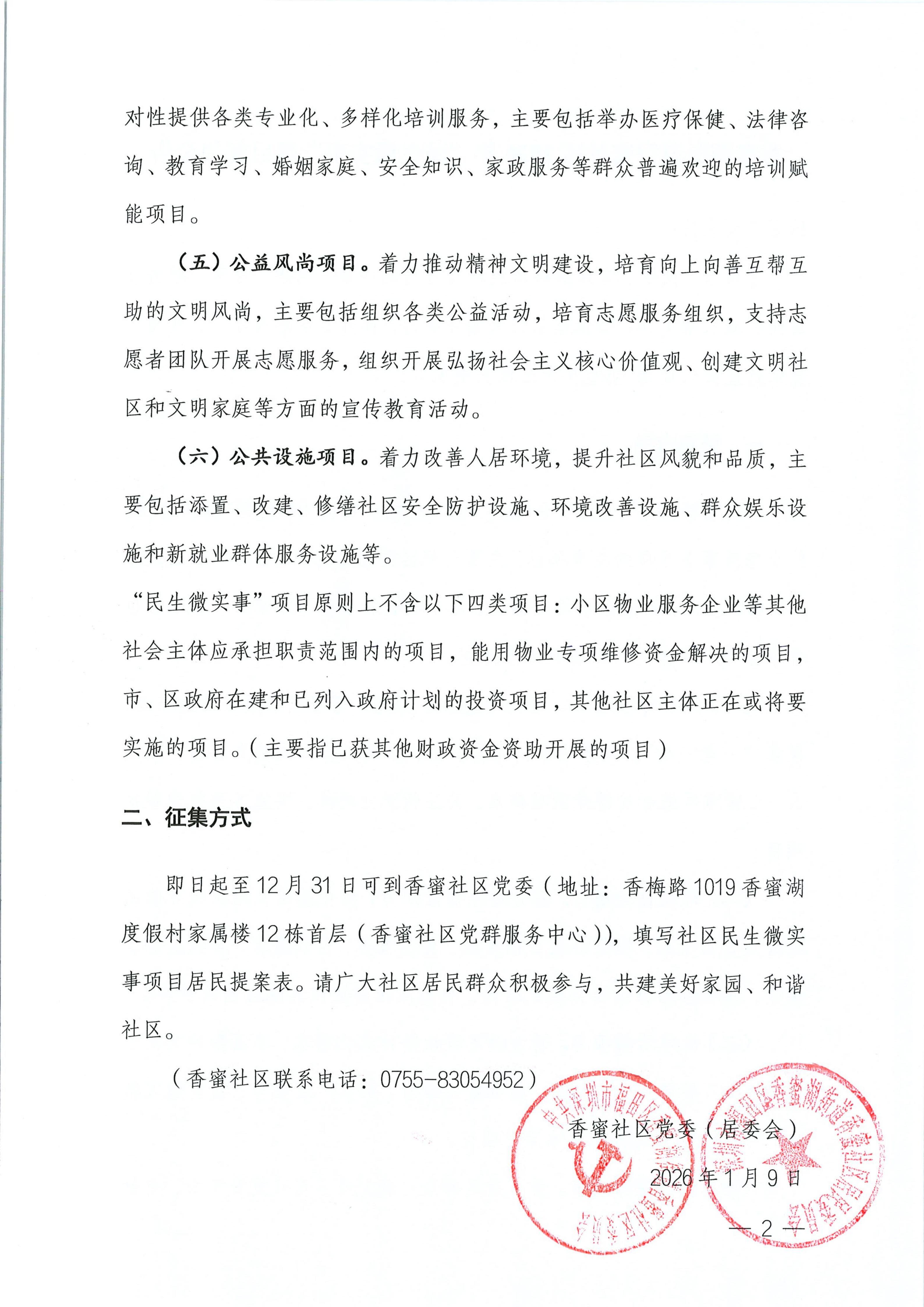 项目公示|福田区香蜜湖街道香蜜社区关于2026年“民生微实事”项目征集的公告