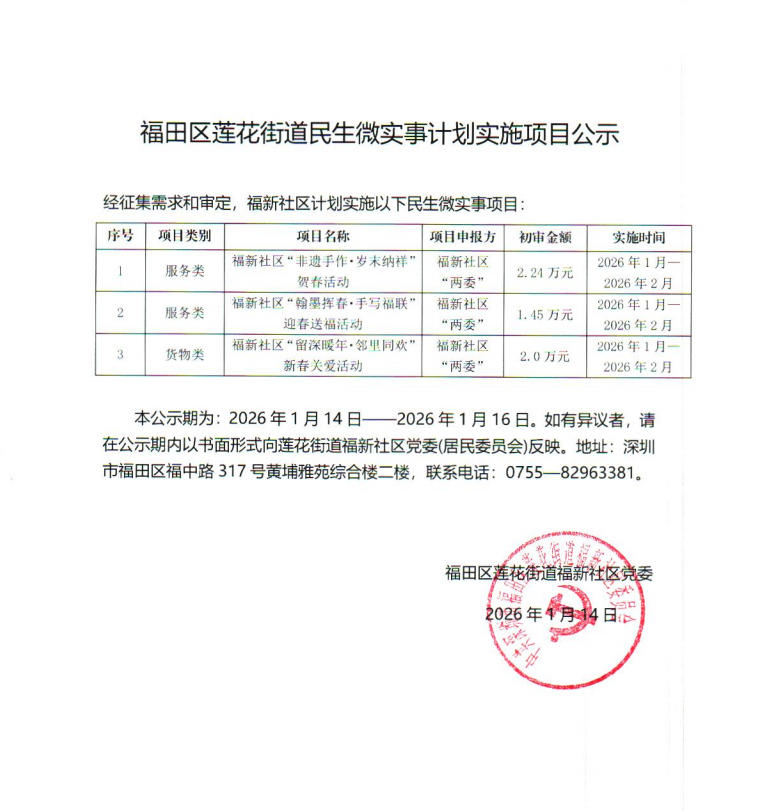 项目公示|福田区莲花街道福新社区2026年“民生微实事”项目计划实施项目公示