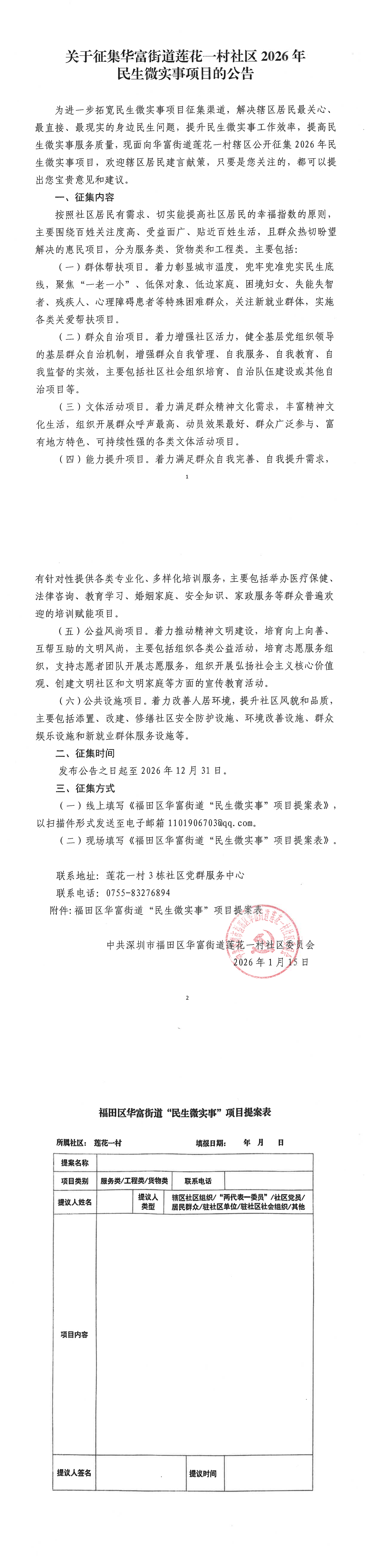 项目公示|福田区华富街道莲花一村社区2026年民生微实事项目征集公告