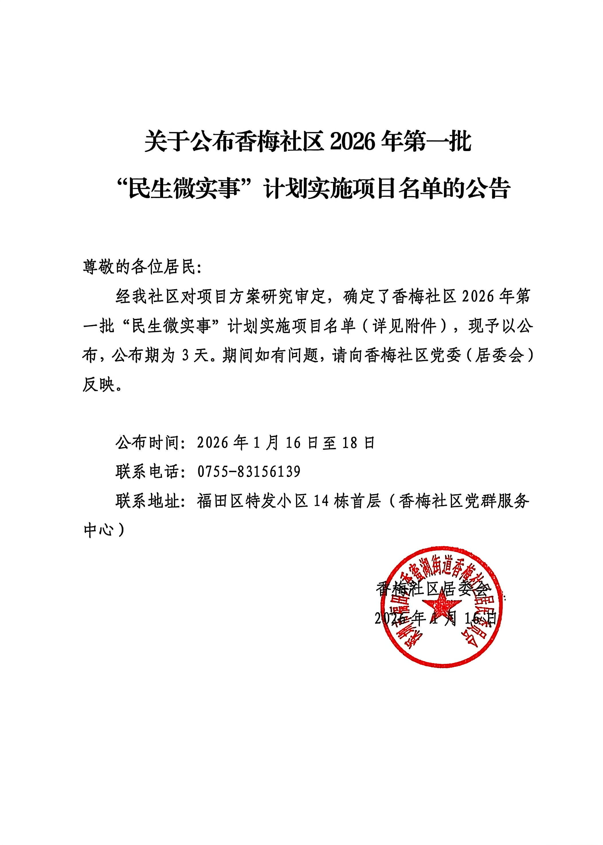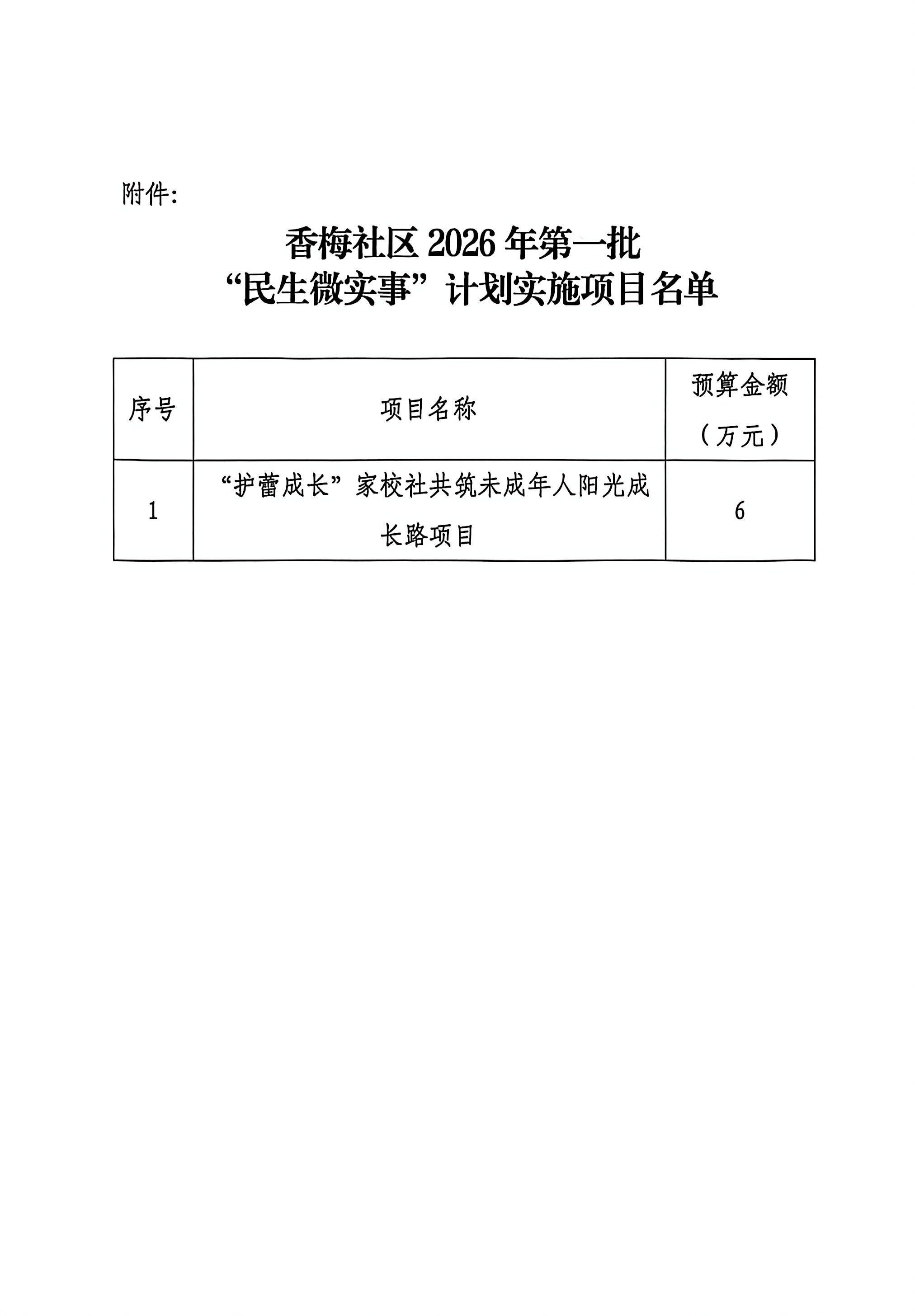 项目公示|福田区香蜜湖街道香梅社区2026年第一批“民生微实事”计划实施项目名单的公告