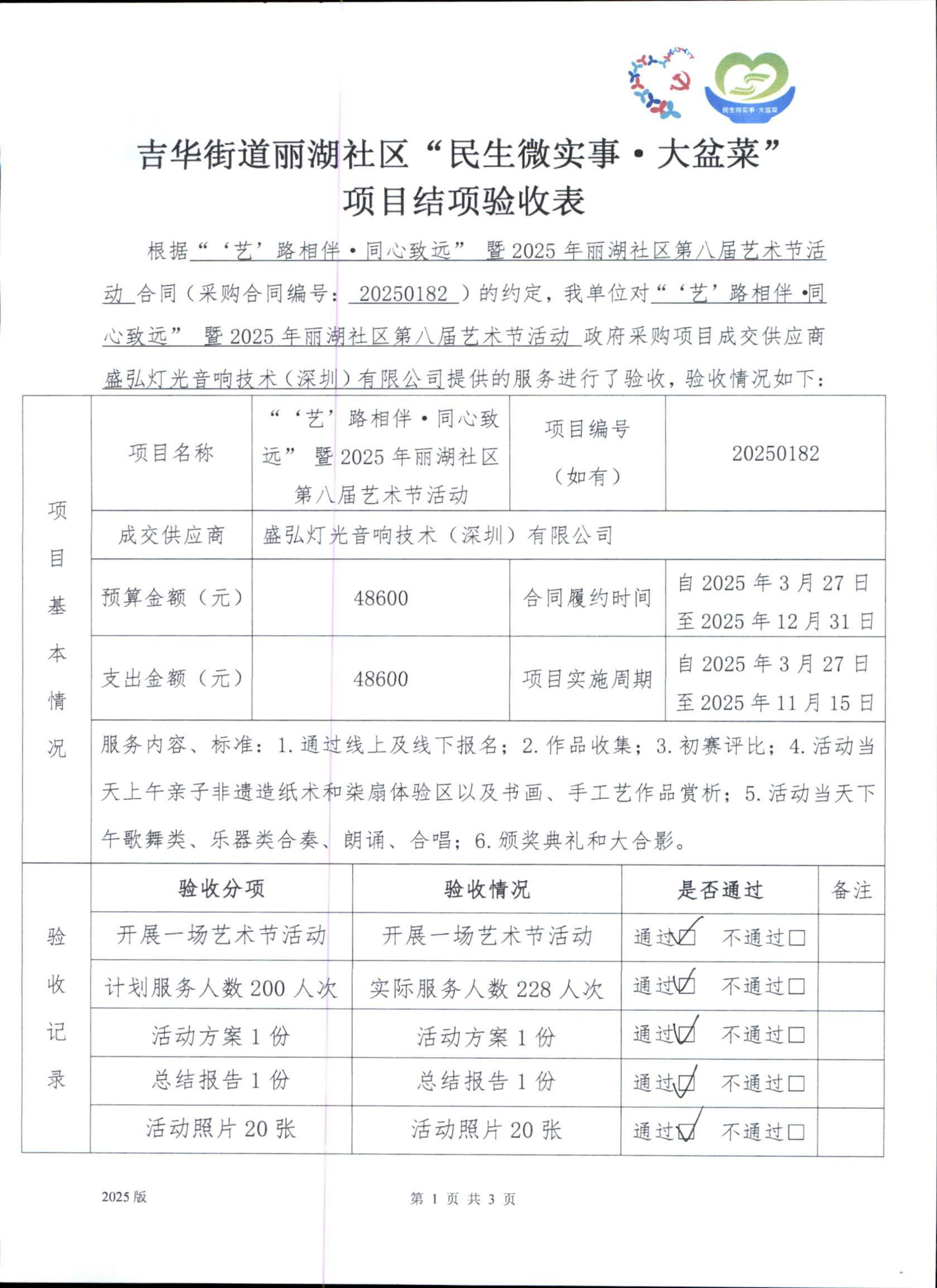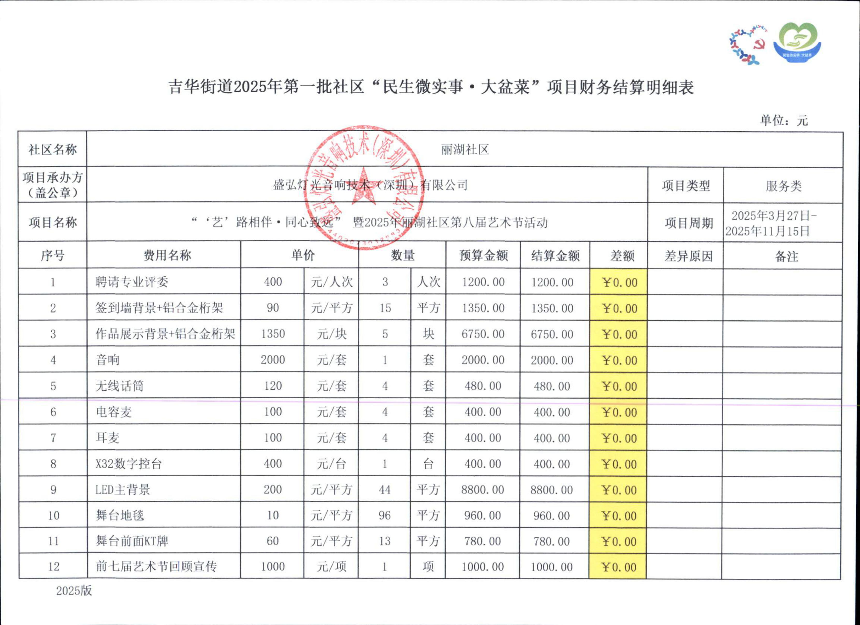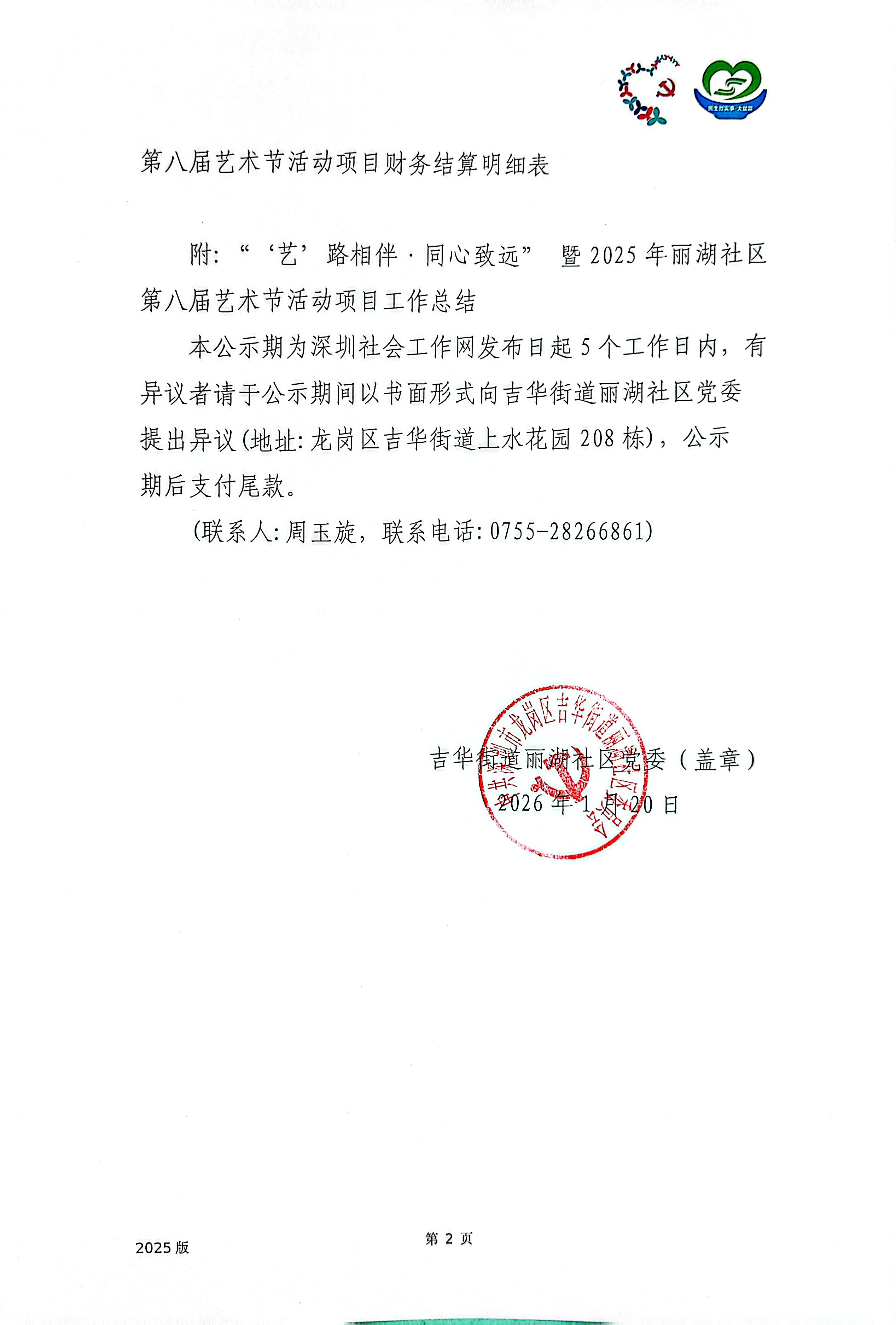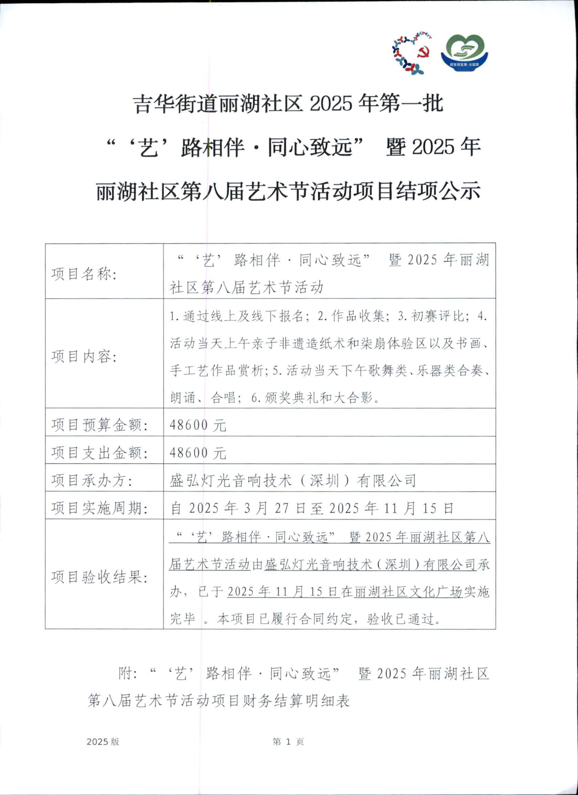 项目公示|龙岗区吉华街道丽湖社区2025年第一批‘‘‘艺’路相伴·同心致远’’暨2025年丽湖社区第八届艺术节活动“民生微实事·大盆菜”项目结项公示
