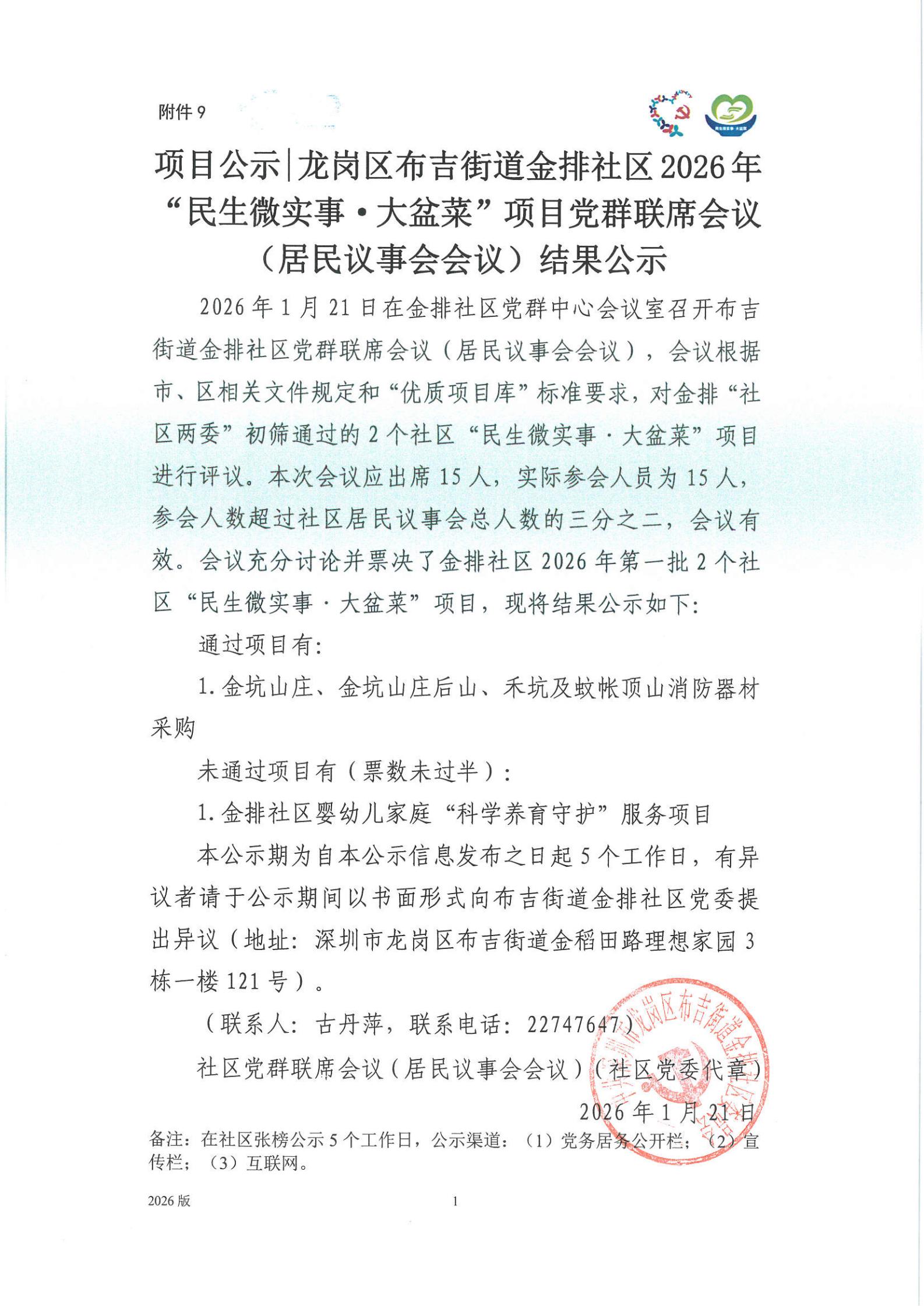 项目公示|龙岗区布吉街道金排社区2026年“民生微实事·大盆菜”项目党群联席会议(居民议事会会议)结果公示