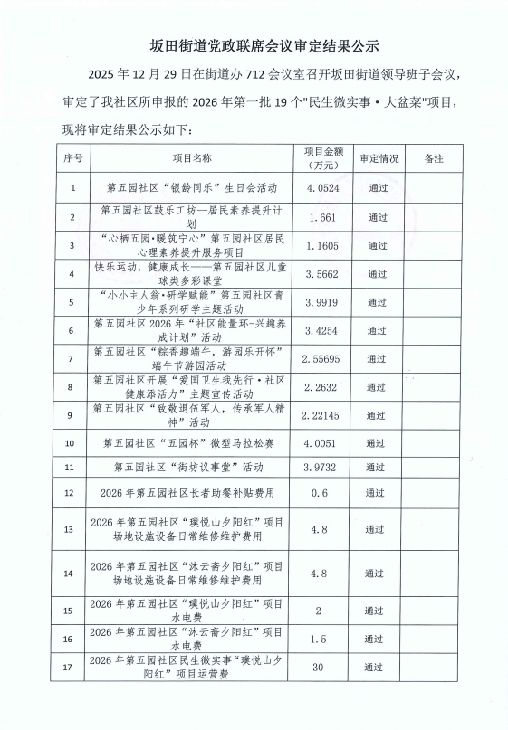 项目公示|龙岗区坂田街道第五园社区2026年第一批“民生微实事·大盆菜”街道党政联席会议审定结果公示