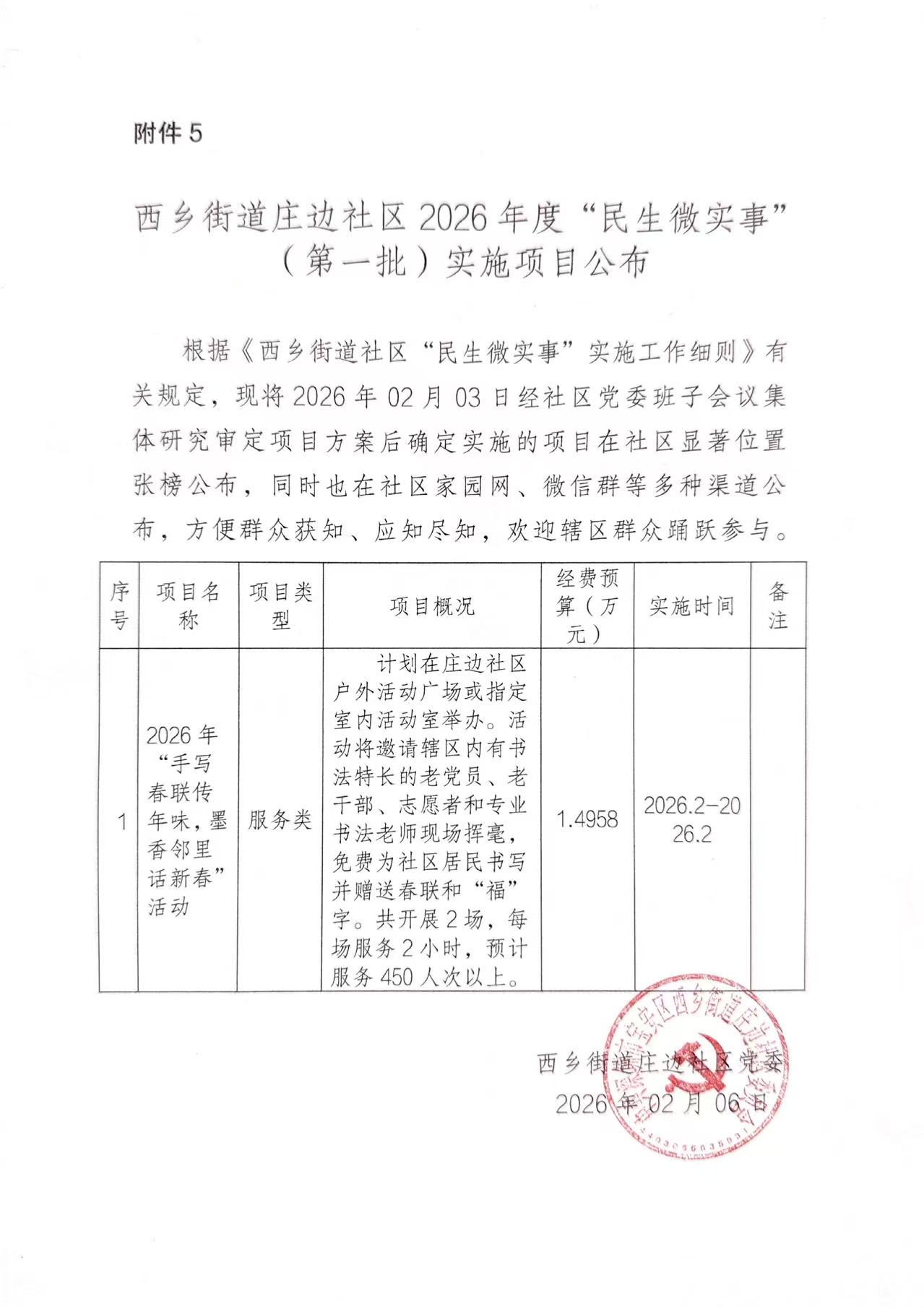 项目公示|宝安区西乡街道庄边社区2026年度“民生微实事”项目(第一批)实施项目公布