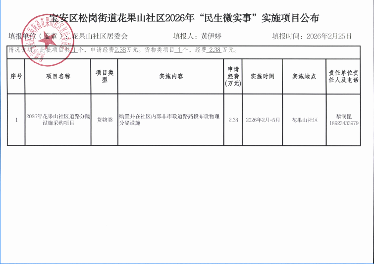 项目公示|宝安区松岗街道花果山社区2026年“民生微实事”实施项目公布