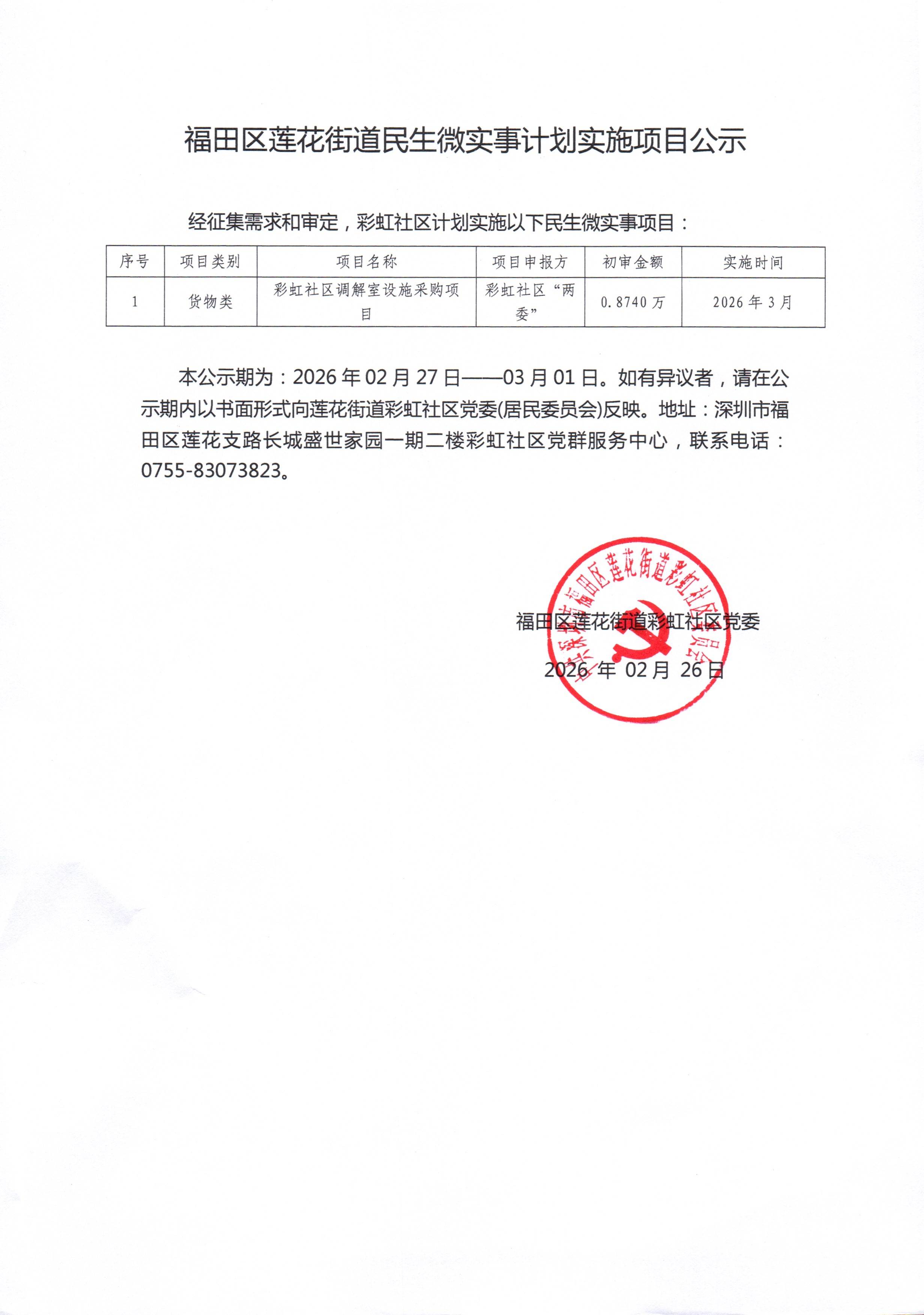 项目公示|福田区莲花街道彩虹社区2026年“民生微实事”项目计划实施项目公示