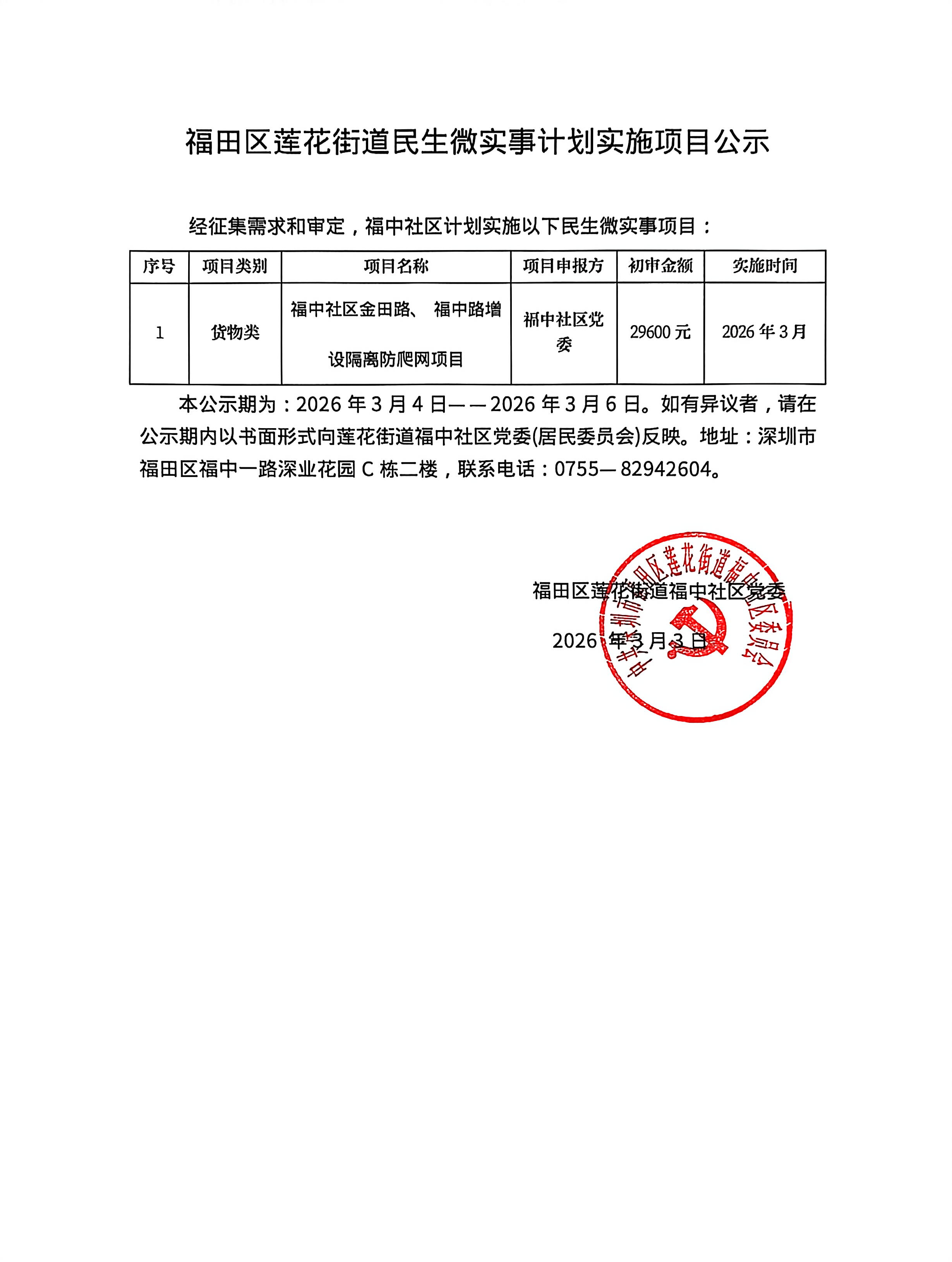 项目公示|福田区莲花街道福中社区民生微实事计划实施项目公示
