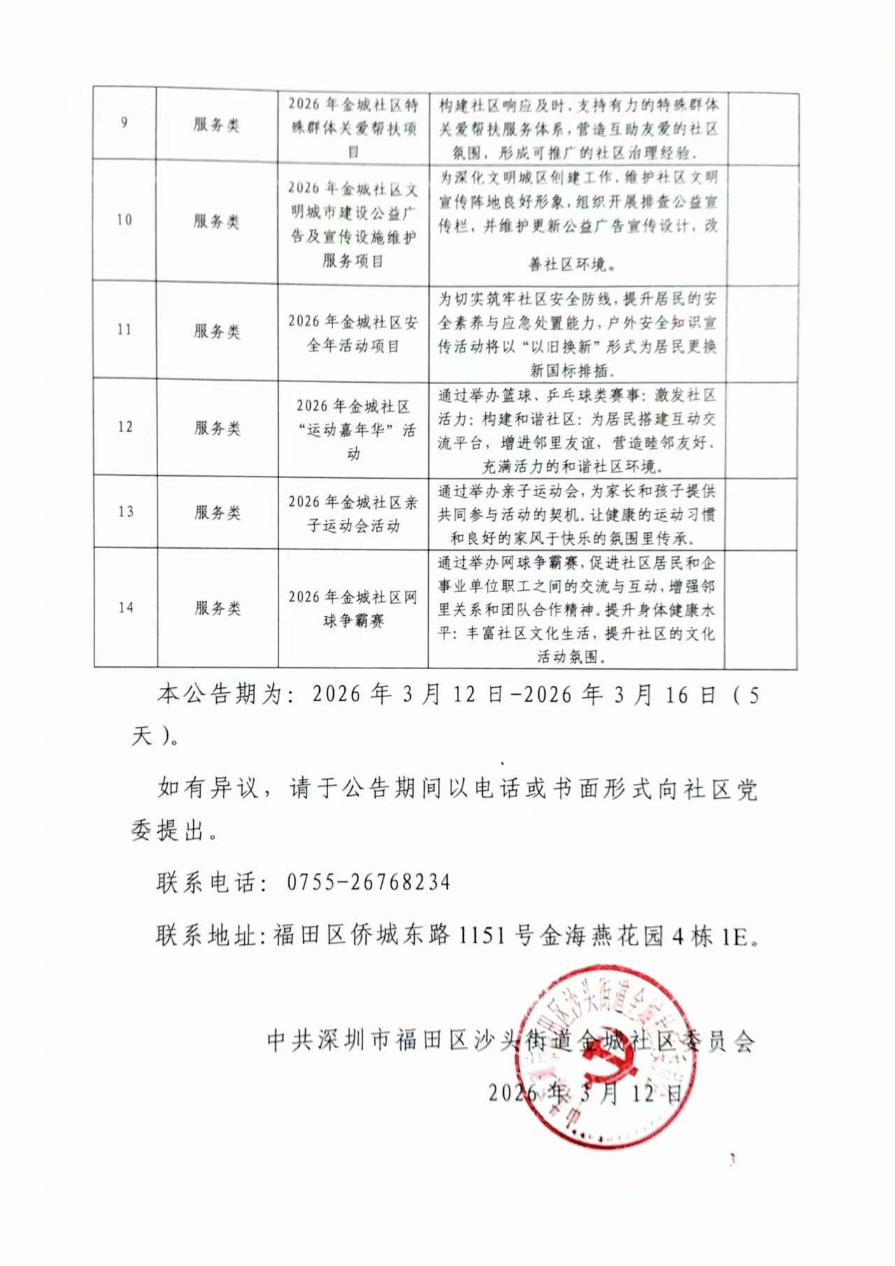 项目公示|福田区沙头街道金城社区2026年关于实施第一批“民生微实事”项目的公告