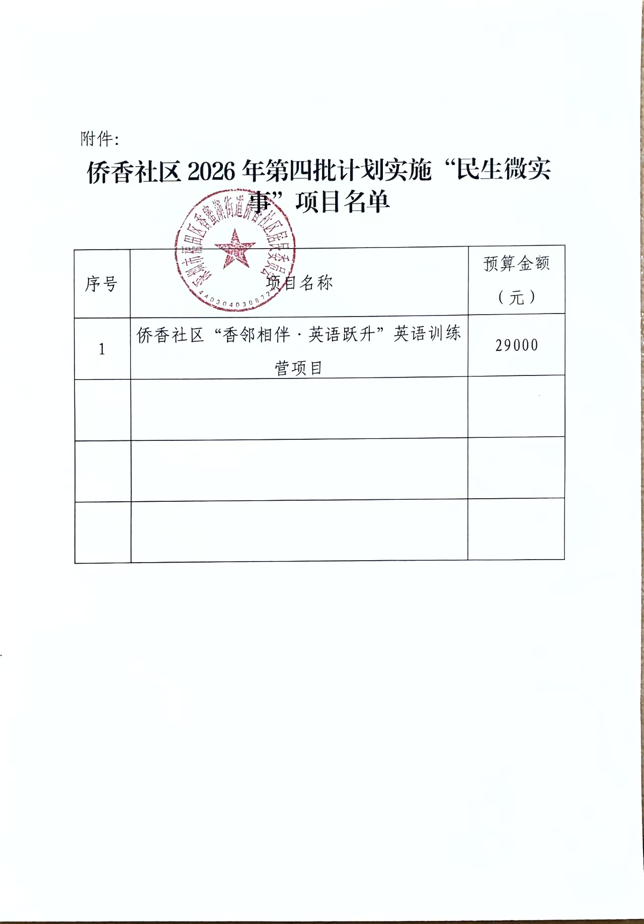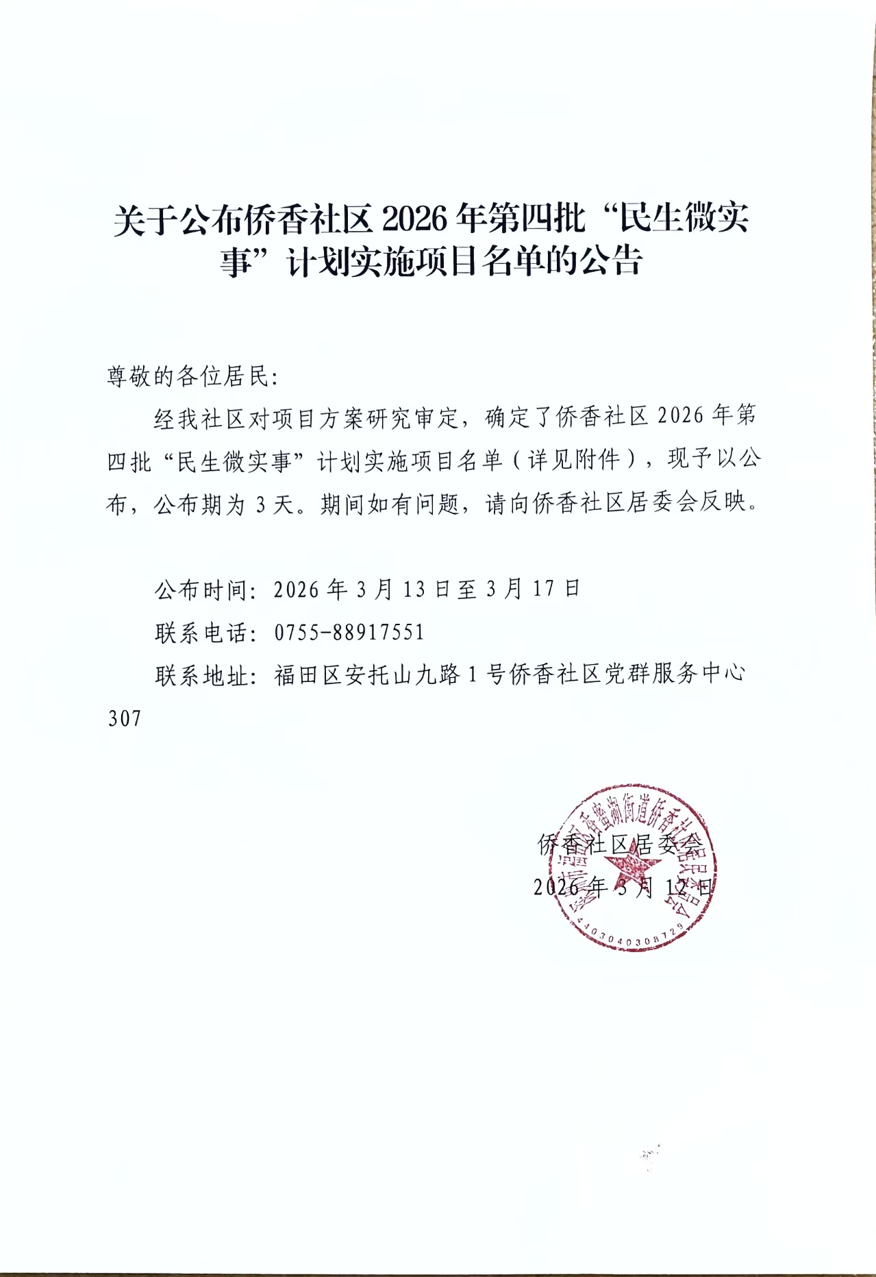 项目公示|福田区香蜜湖街道侨香社区2026年“民生微实事”计划实施项目名单的公告(第四批)