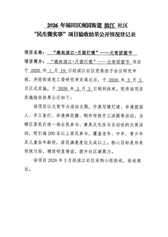 项目公示|福田区南园街道滨江社区2026年“潮起滨江·月圆灯暖”——元宵团圆节“民生微实事”项目验收结果公开情况登记表