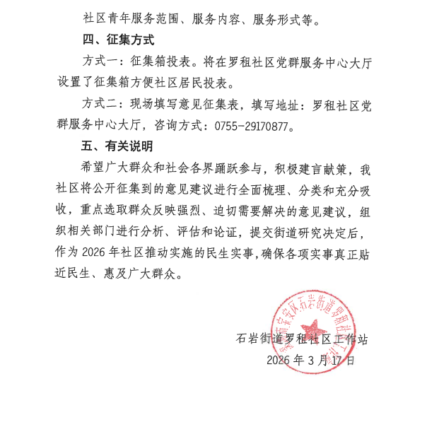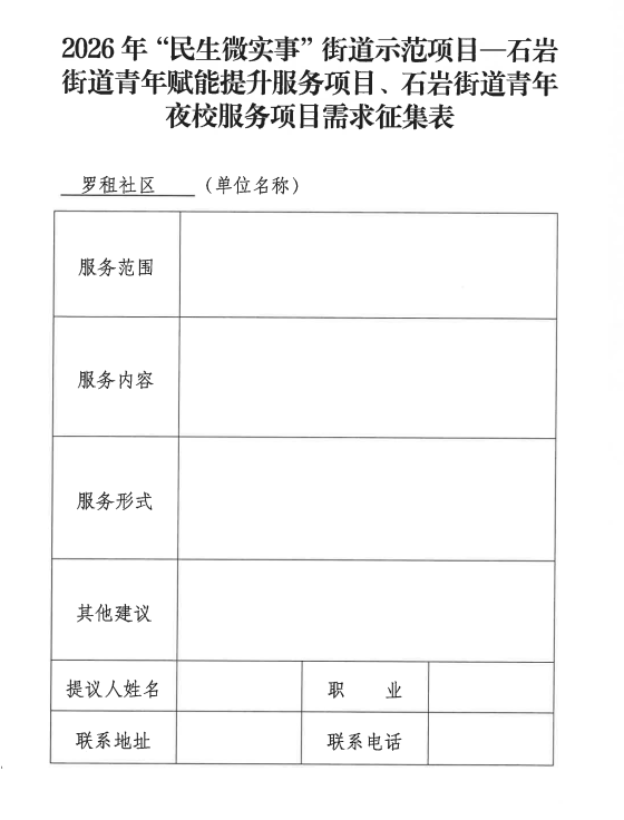 项目公示|宝安区石岩街道罗租社区2026年“民生微实事”街道示范项目——石岩街道青年赋能提升服务项目、石岩街道青年培优服务项目、石岩街道青年夜校服务项目需求征集公告