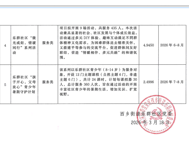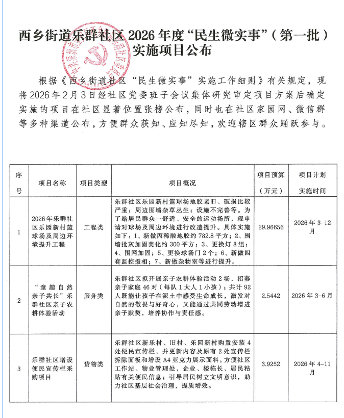 项目公示|宝安区西乡街道乐群社区2026年度“民生微实事”(第一批)实施项目公布
