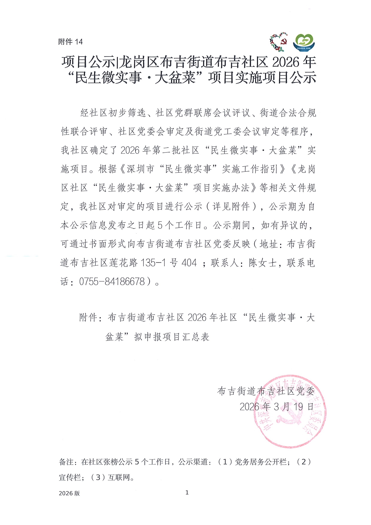 项目公示|龙岗区布吉街道布吉社区2026年“民生微实事·大盆菜”项目实施项目公示