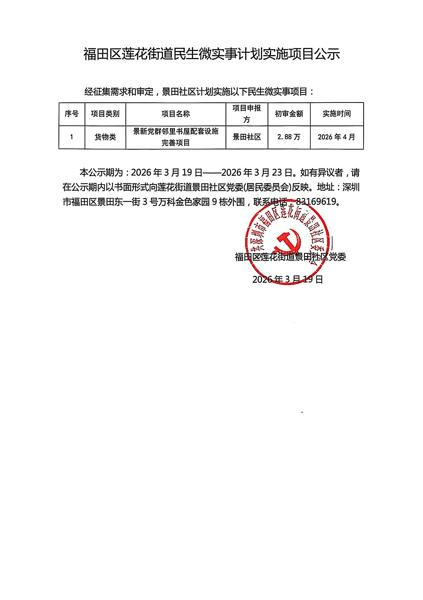 项目公示|福田区莲花街道景田社区2026年“民生微实事”计划实施项目公示