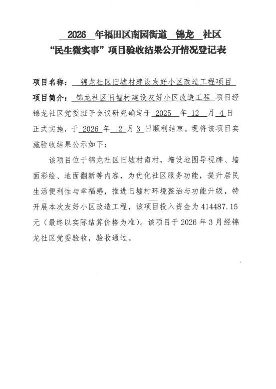 项目公示|福田区南园街道锦龙社区旧墟村建设友好小区改造工程项目“民生微实事”项目验收结果公开情况登记表