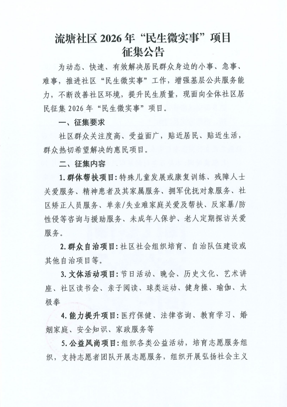 项目公示|宝安区西乡街道流塘社区2026年“民生微实事”项目征集公告