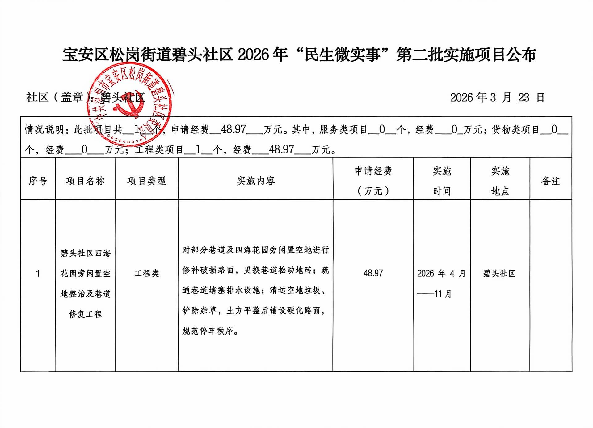 项目公示|宝安区松岗街道碧头社区2026年“民生微实事”第二批实施项目公布