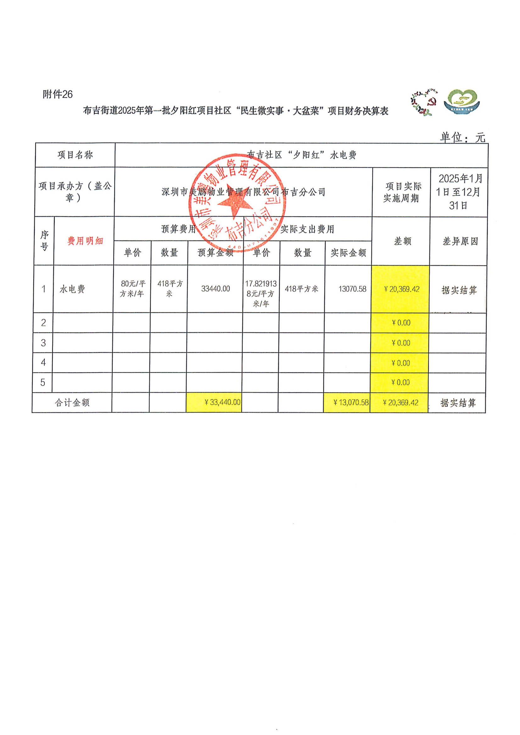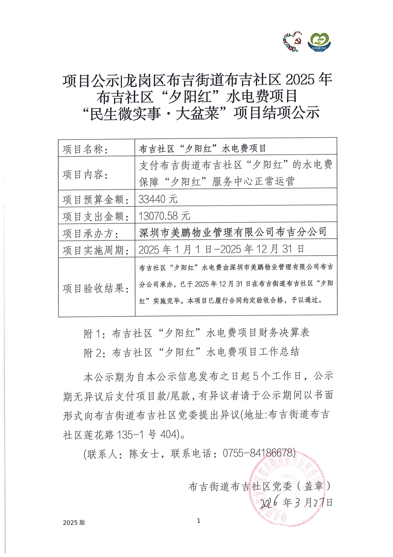 项目公示|龙岗区布吉街道布吉社区2025年布吉社区“夕阳红”水电费项目“民生微实事·大盆菜”项目结项公示