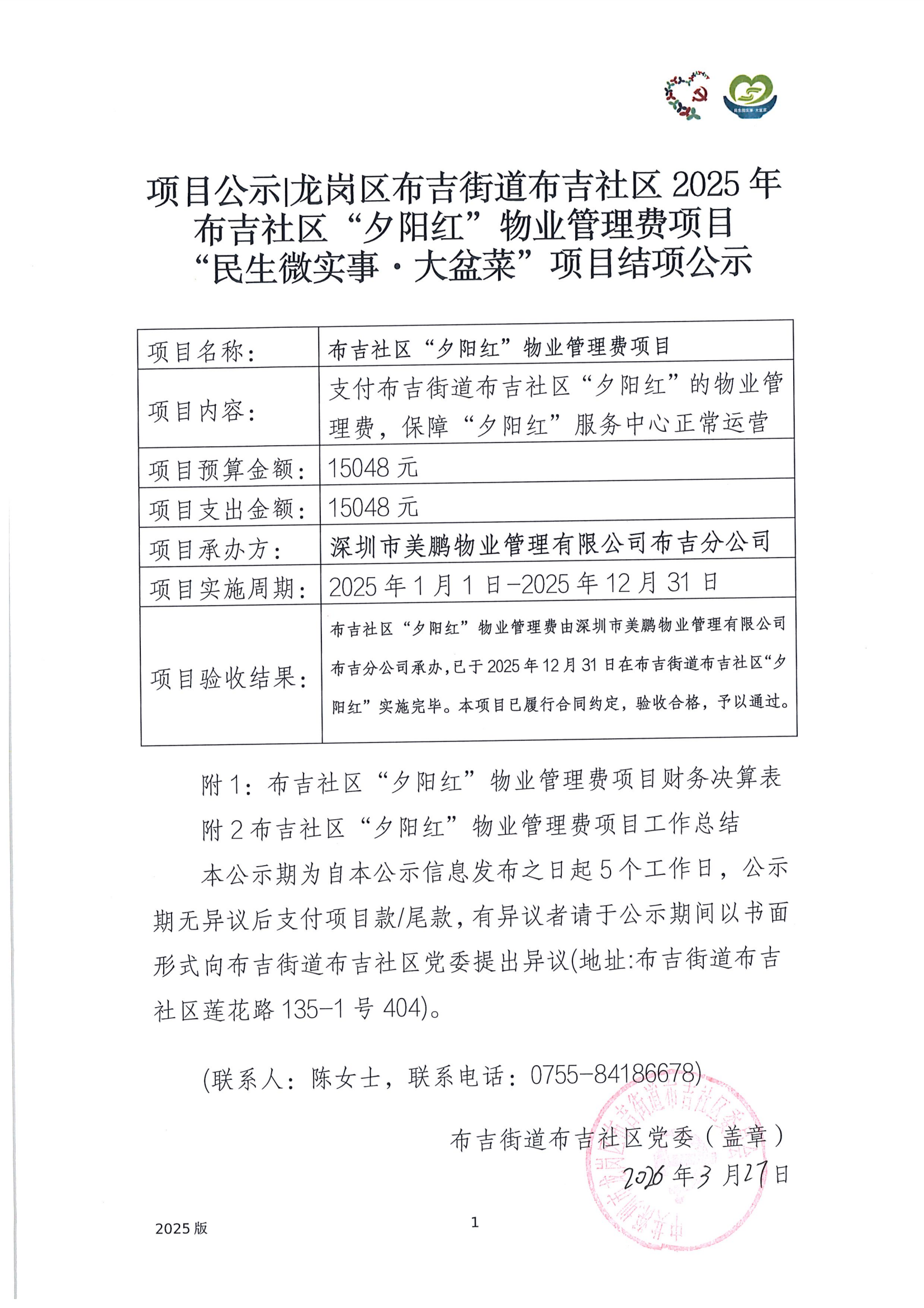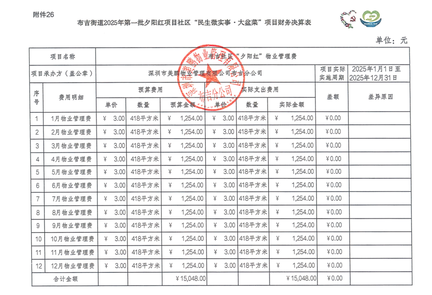 项目公示|龙岗区布吉街道布吉社区2025年布吉社区“夕阳红”物业管理费项目“民生微实事·大盆菜”项目结项公示