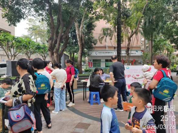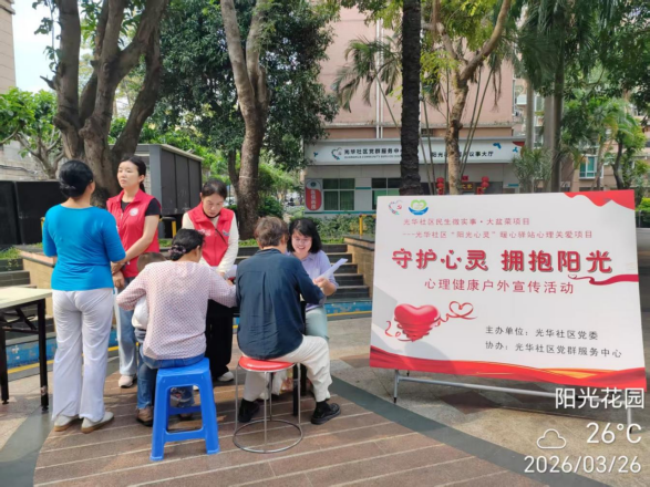 为进一步普及心理健康知识,关爱居民心灵健康,扎实推进光华社区“阳光心灵”暖心驿站心理关爱项目走深走实,2026年3月26日下午在光华社区党委的指导下,充分发挥党建引领作用,依托“民生微实事·大盆菜”项目,于阳光花园大象广场开展“守护心灵,拥抱阳光”户外心理健康宣传活动。活动聚焦居民日常心理需求,以多元形式传递暖心关怀,吸引200余名居民踊跃参与,切实将心理关爱服务送到居民家门口,现场氛围温馨热烈。