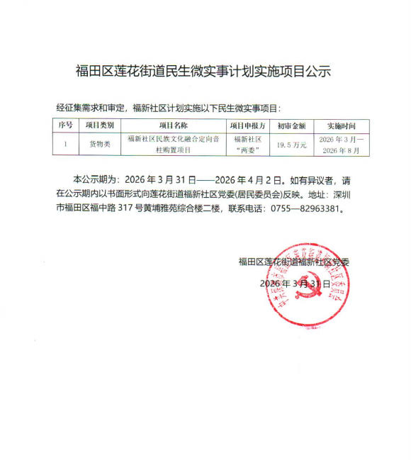 项目公示|福田区莲花街道福新社区2026年“民生微实事”计划实施项目公示