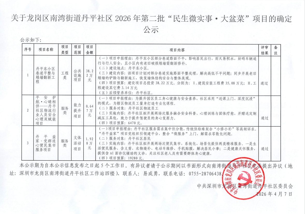 项目公示|龙岗区南湾街道丹平社区2026年第二批“民生微实事·大盆菜”项目公示