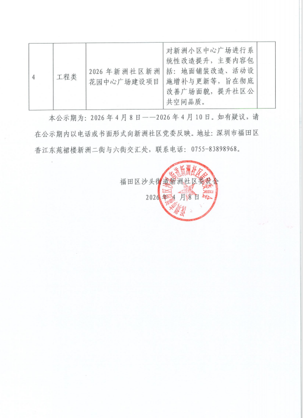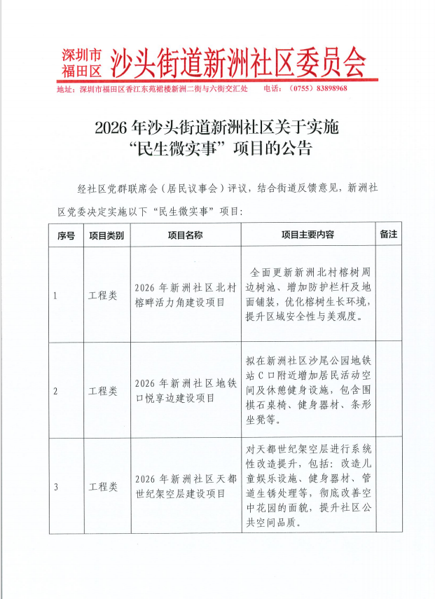 项目公示|福田区沙头街道新洲社区2026年关于实施“民生微实事”项目的公告