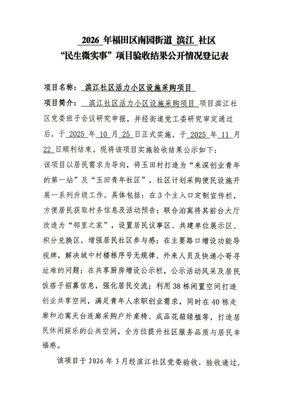 项目公示|福田区南园街道滨江社区2026年活力小区设施采购项目“民生微实事”项目验收结果公开情况登记表