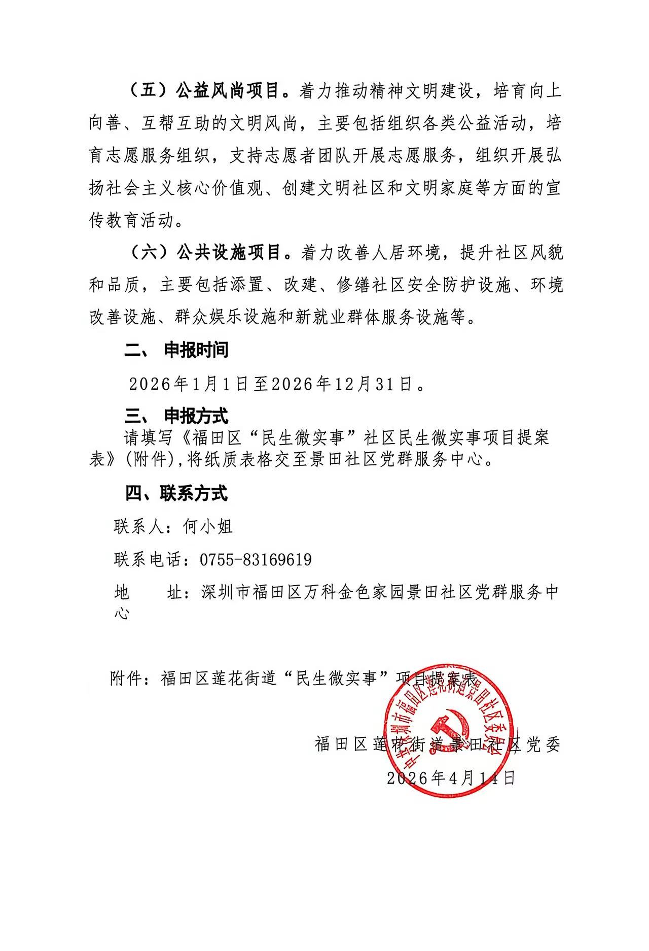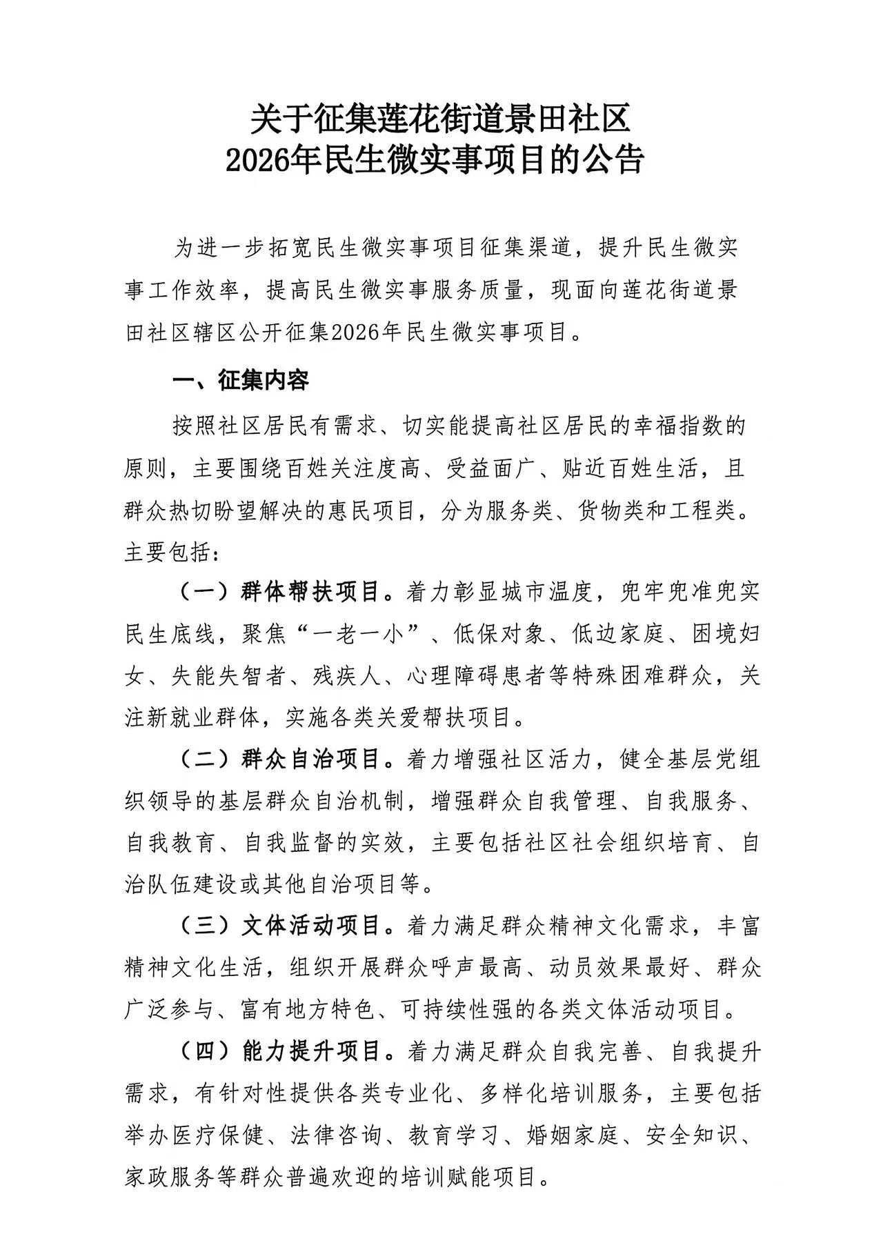 项目公示|福田区莲花街道景田社区2026年民生微实事项目征集公告