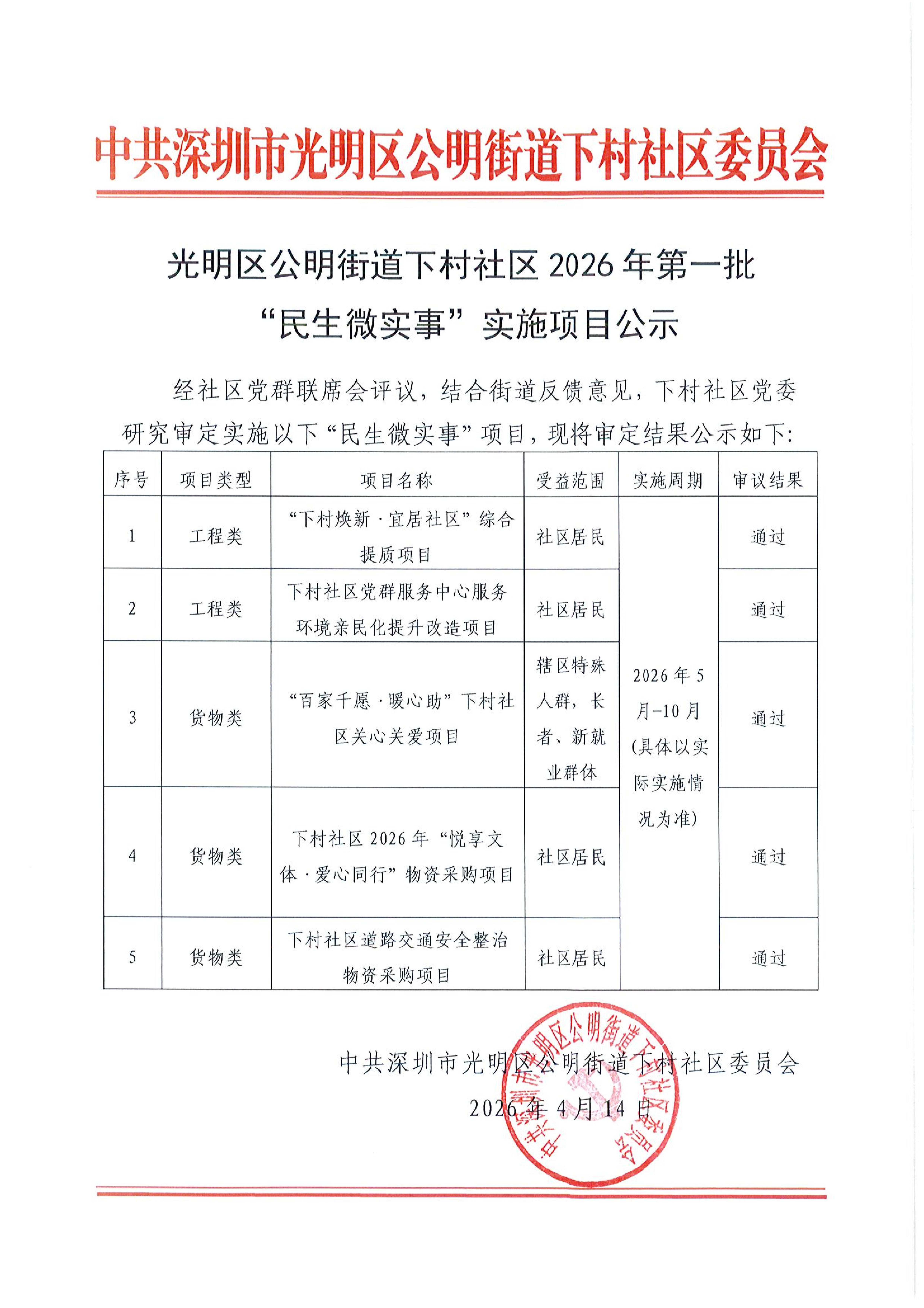项目公示|光明区公明街道下村社区2026年第一批“民生微实事”实施项目公示