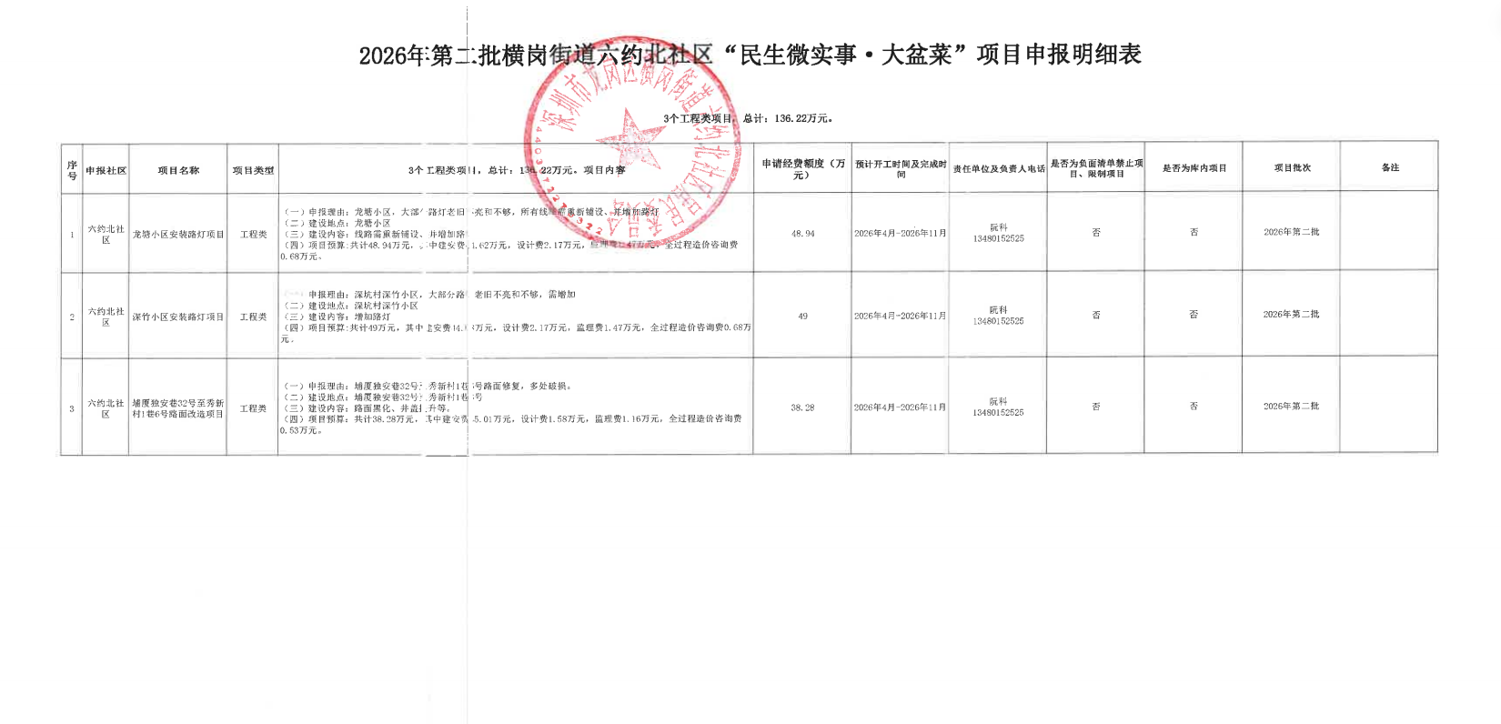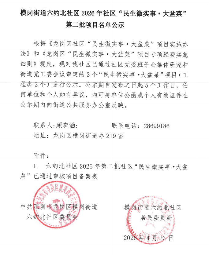 项目公示|龙岗区横岗街道六约北社区2026年社区“民生微实事·大盆菜”第二批项目名单公示