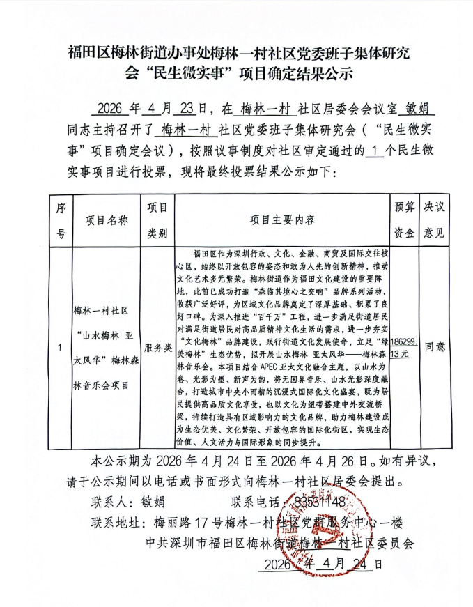 项目公示|福田区梅林街道梅林一村社区“山水梅林 亚太风华”梅林森林音乐会项目“民生微实事”项目确定结果公示