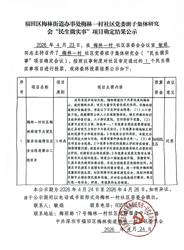 项目公示|福田区梅林街道梅林一村社区梅林绿道节点便民服务设施增设及安全隐患整治工程项目“民生微实事”项目确定结果公示
