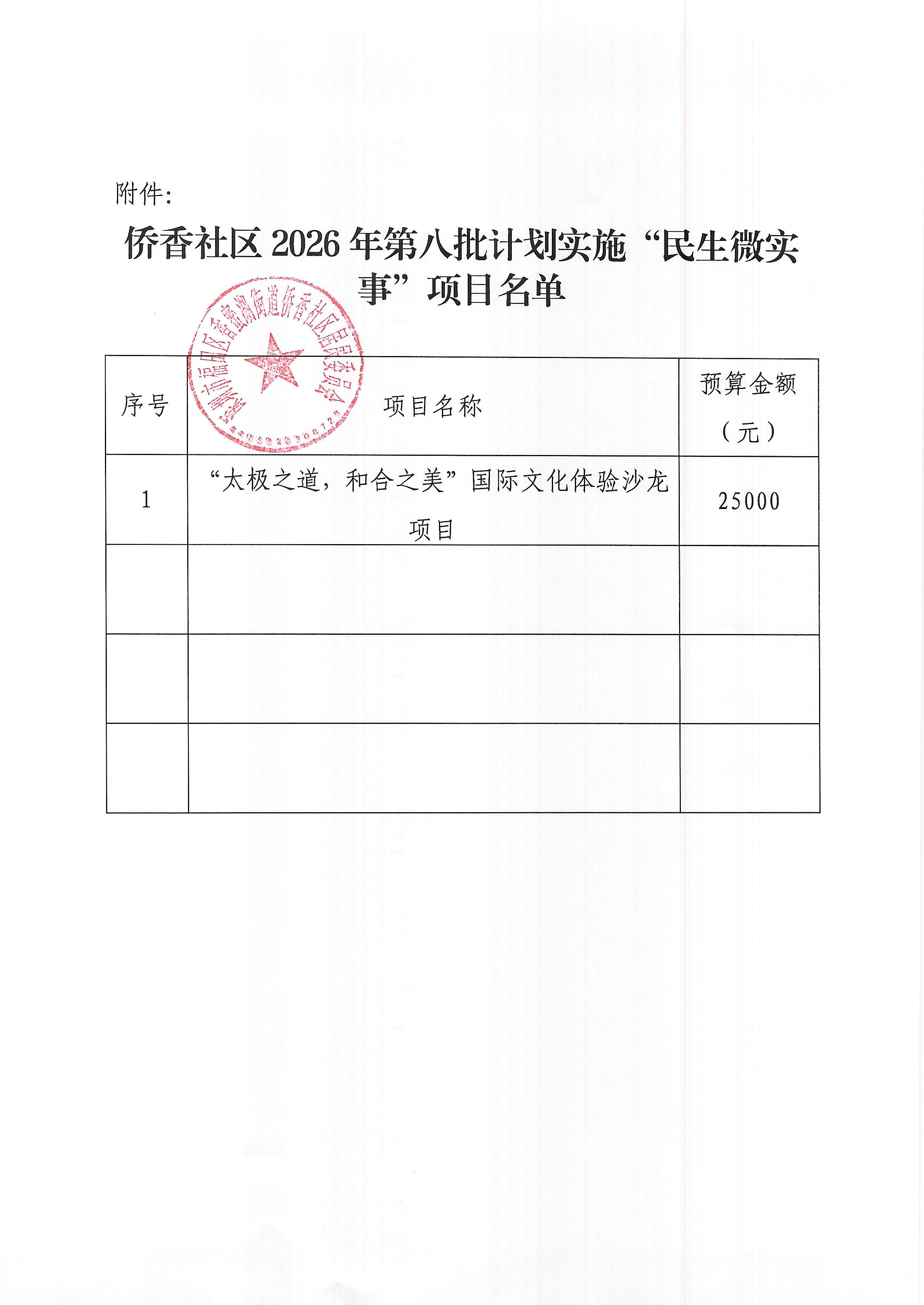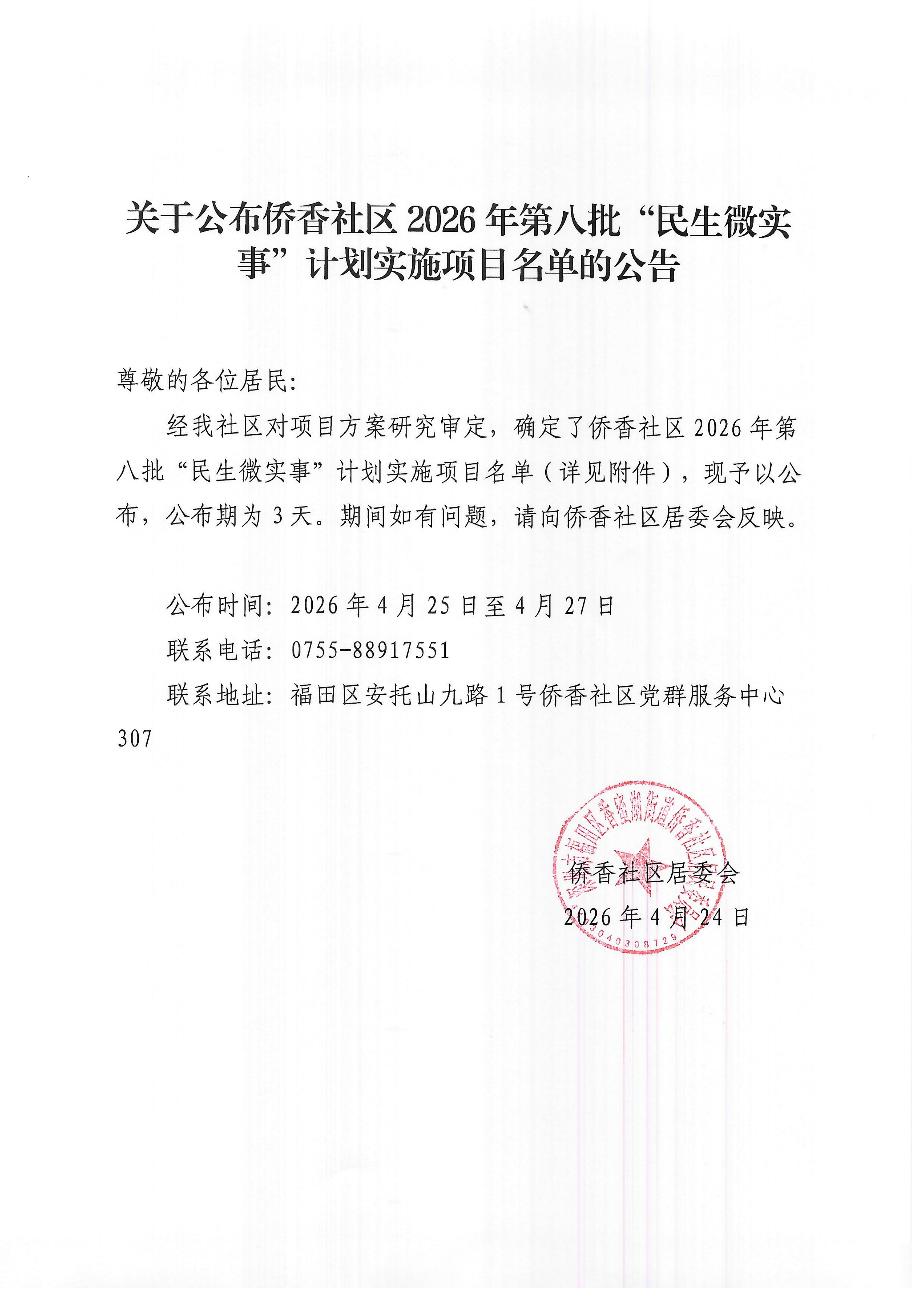 项目公示|福田区香蜜湖街道侨香社区2026年“民生微实事”计划实施项目名单的公告(第八批)