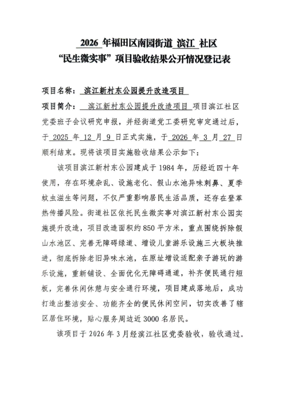 项目公示|福田区南园街道滨江社区2026年滨江新村东公园提升改造项目“民生微实事”项目验收结果公开情况登记表